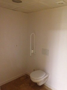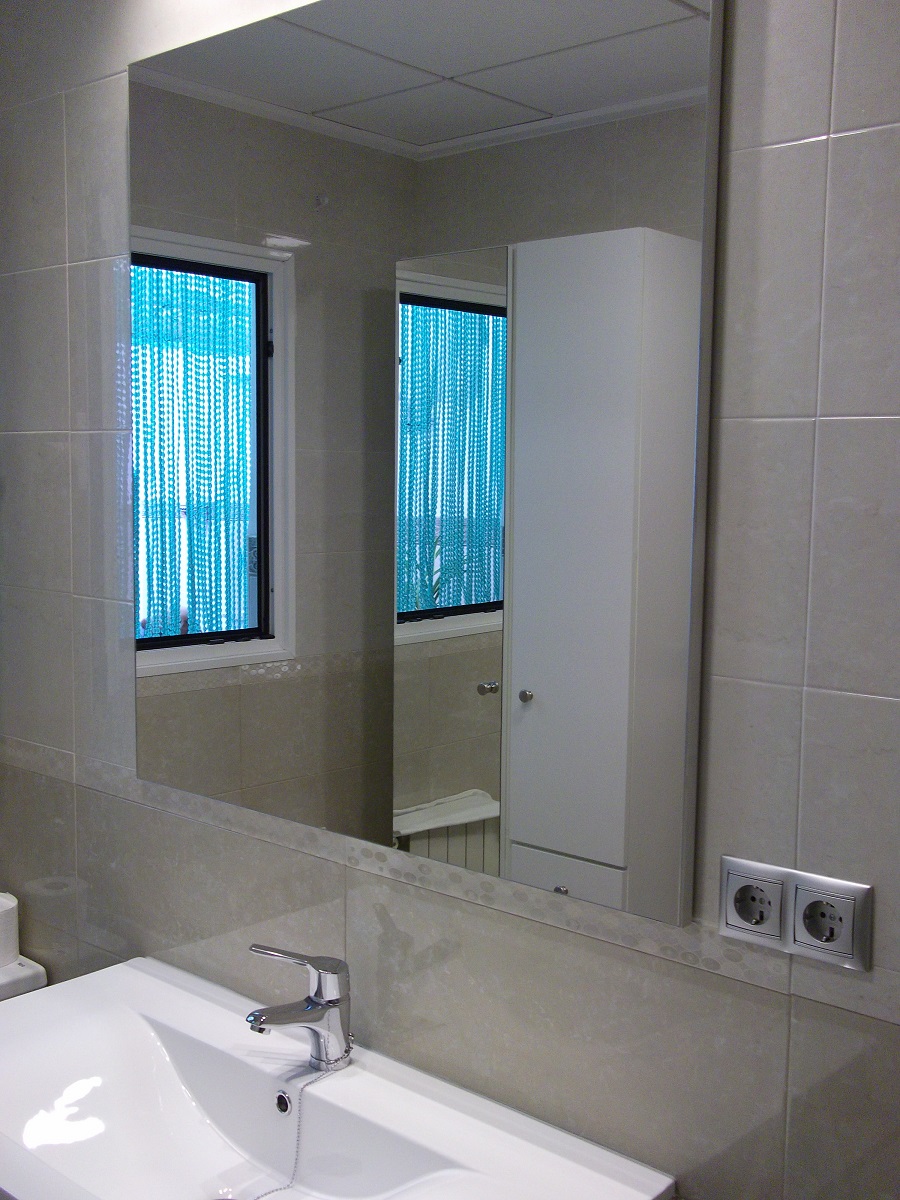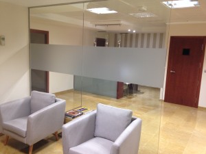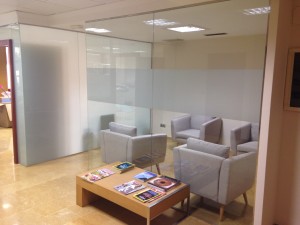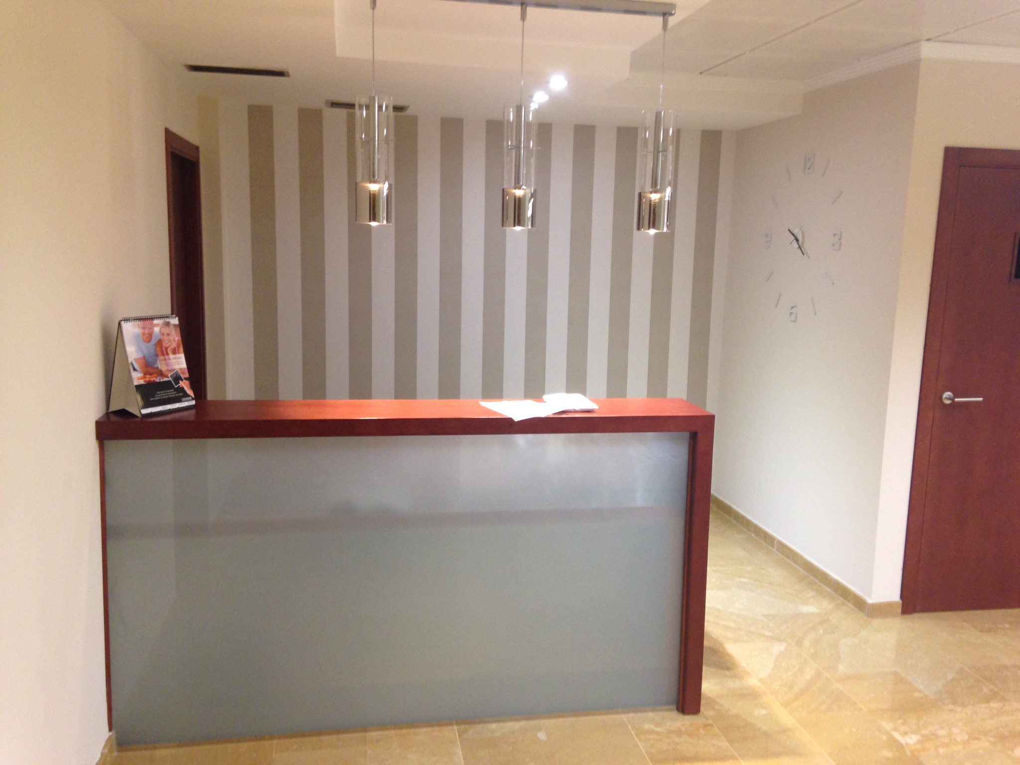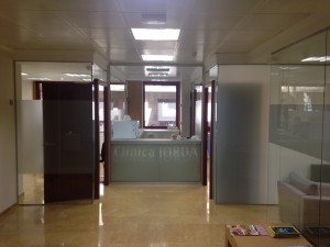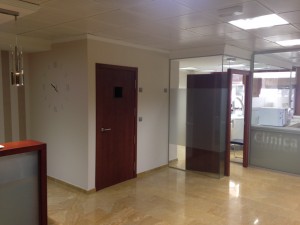 Las particiones se realizaron de vidrio en todo el local, excepto la sala de rayos X con placas de yeso laminado emplomadas. El baño adaptado no se realizó con aplacado cerámico si no con pintura especial para cuartos húmedos.