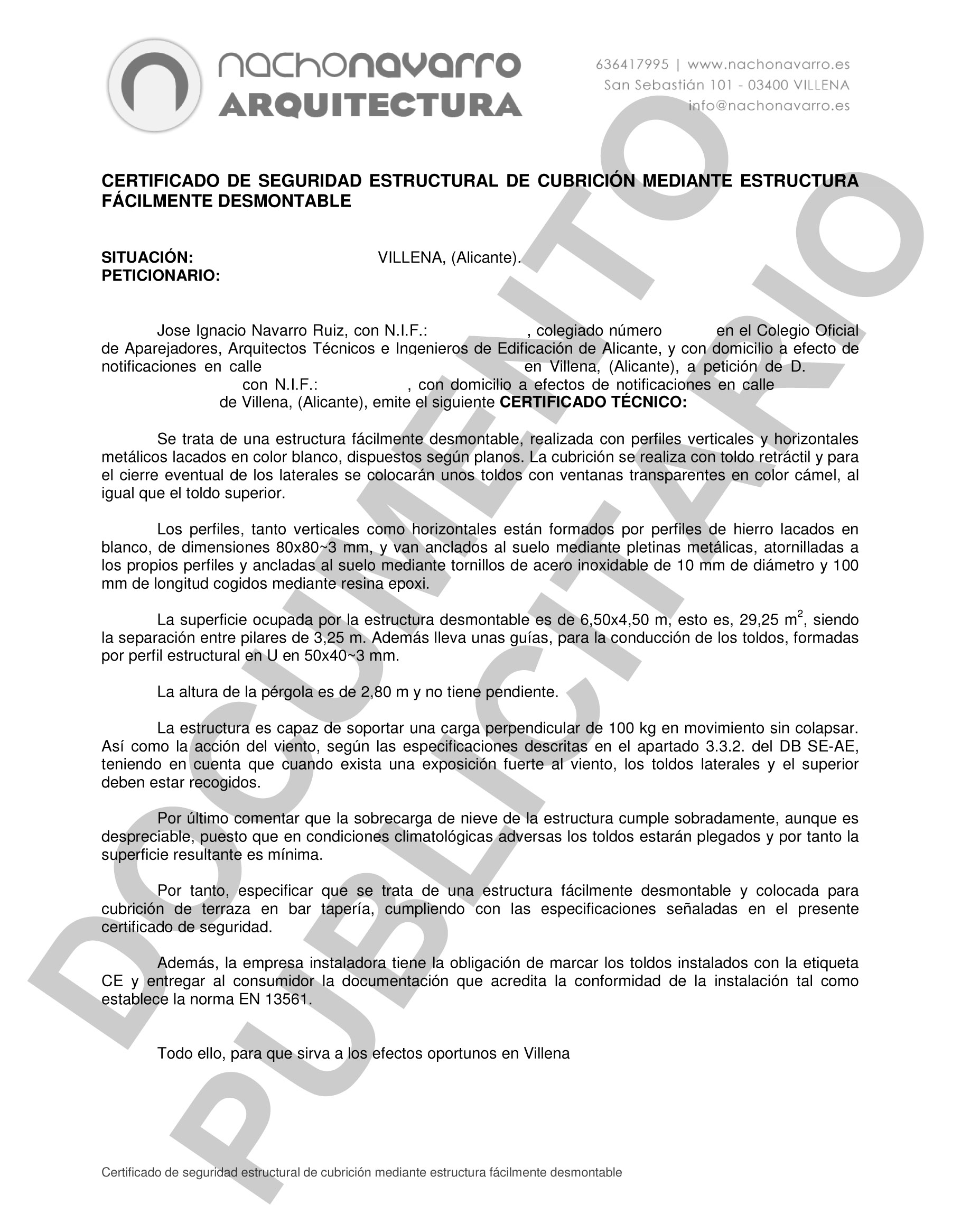 Certificado de seguridad estructural para velador/pérgola en terraza bar/tapería en Villena (Alicante). Recordamos que existe una nueva normativa para terrazas (sillas, mesas, sombrillas y veladores) en Villena.