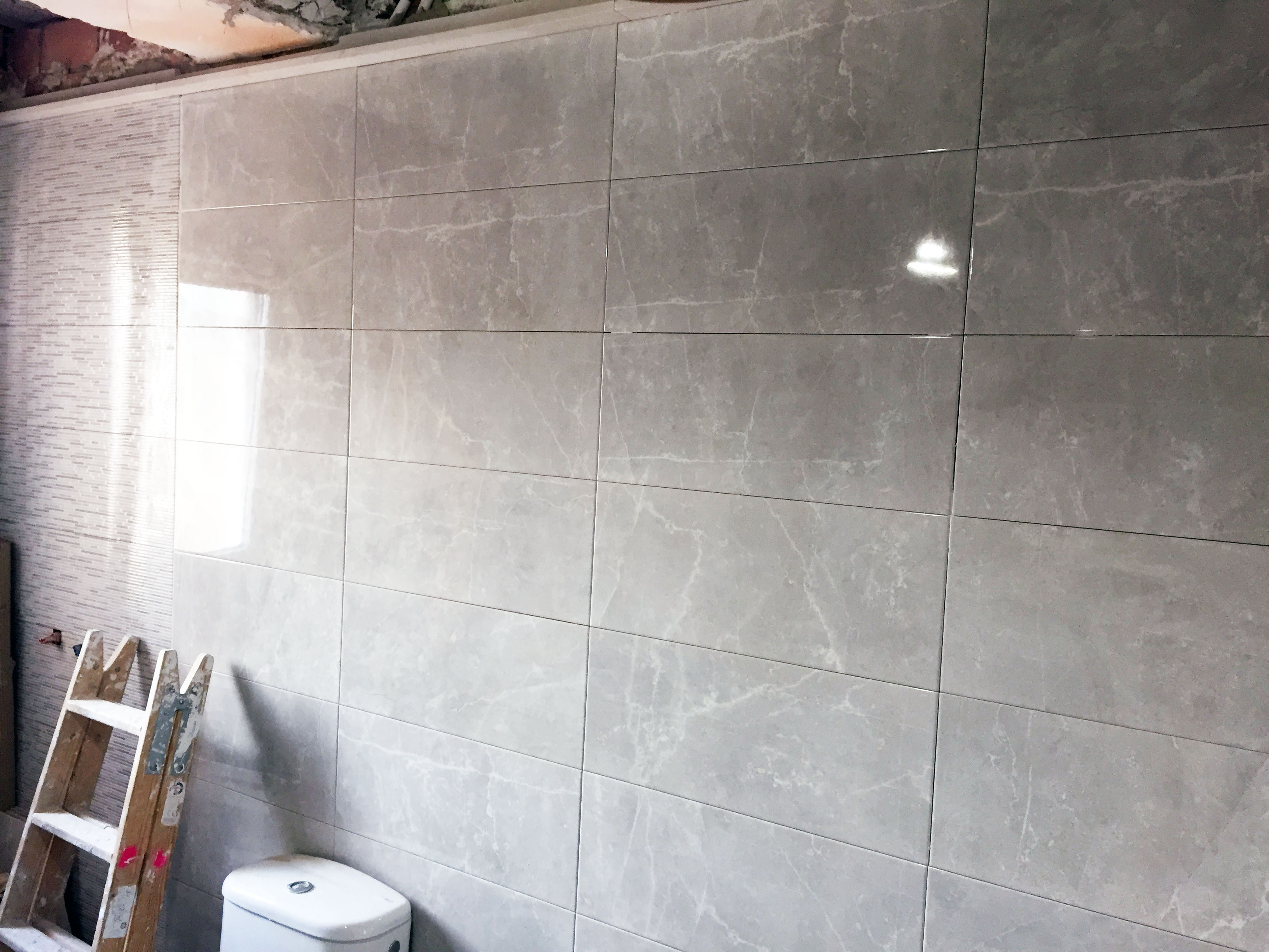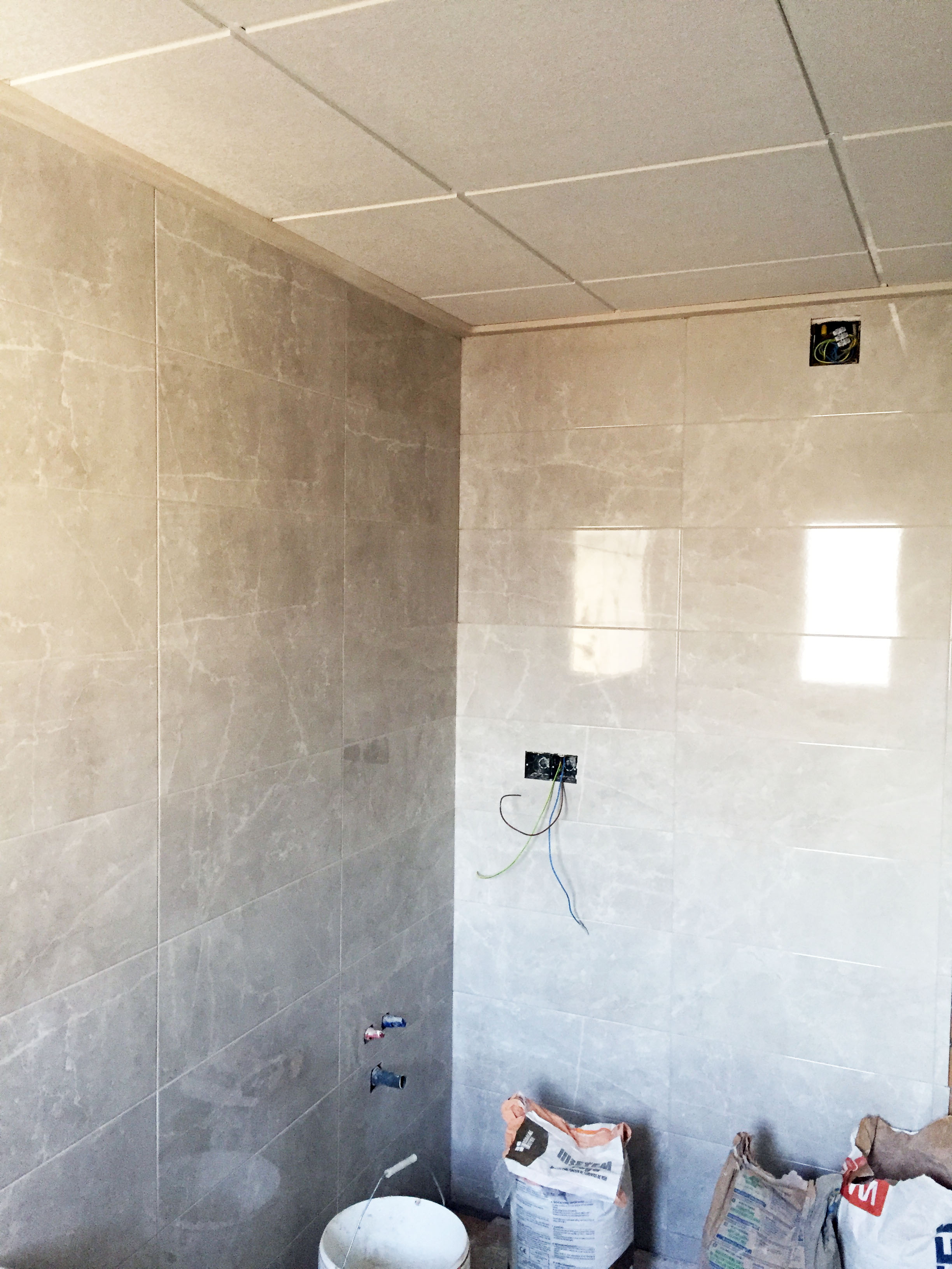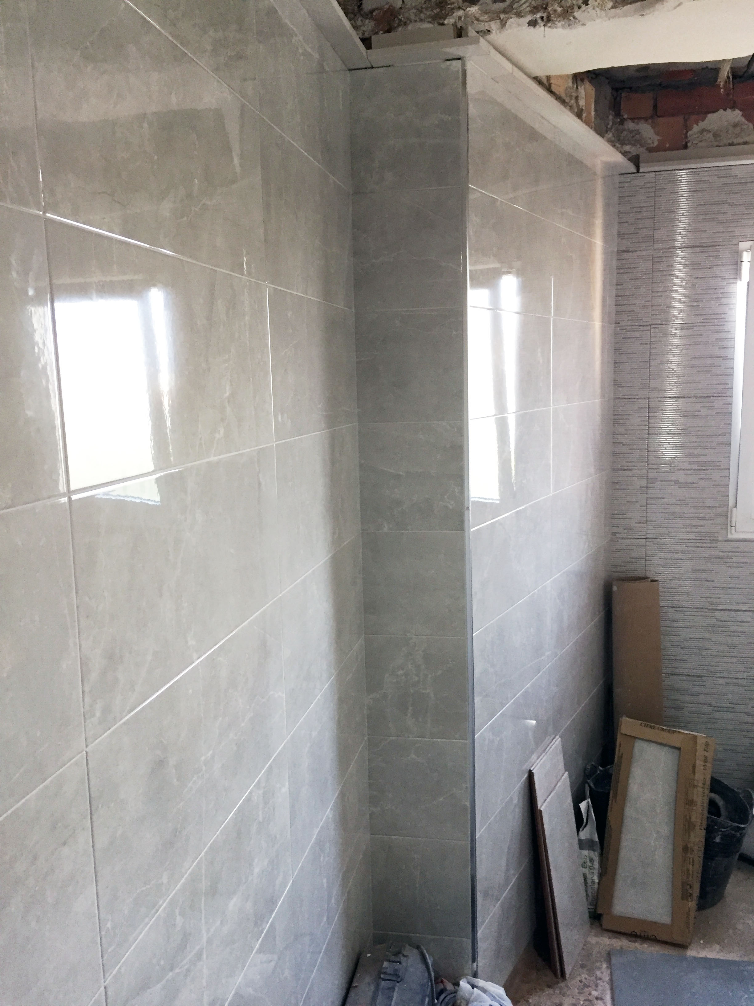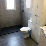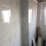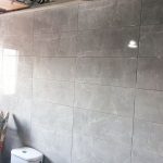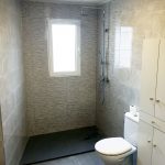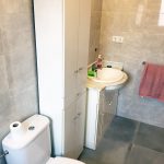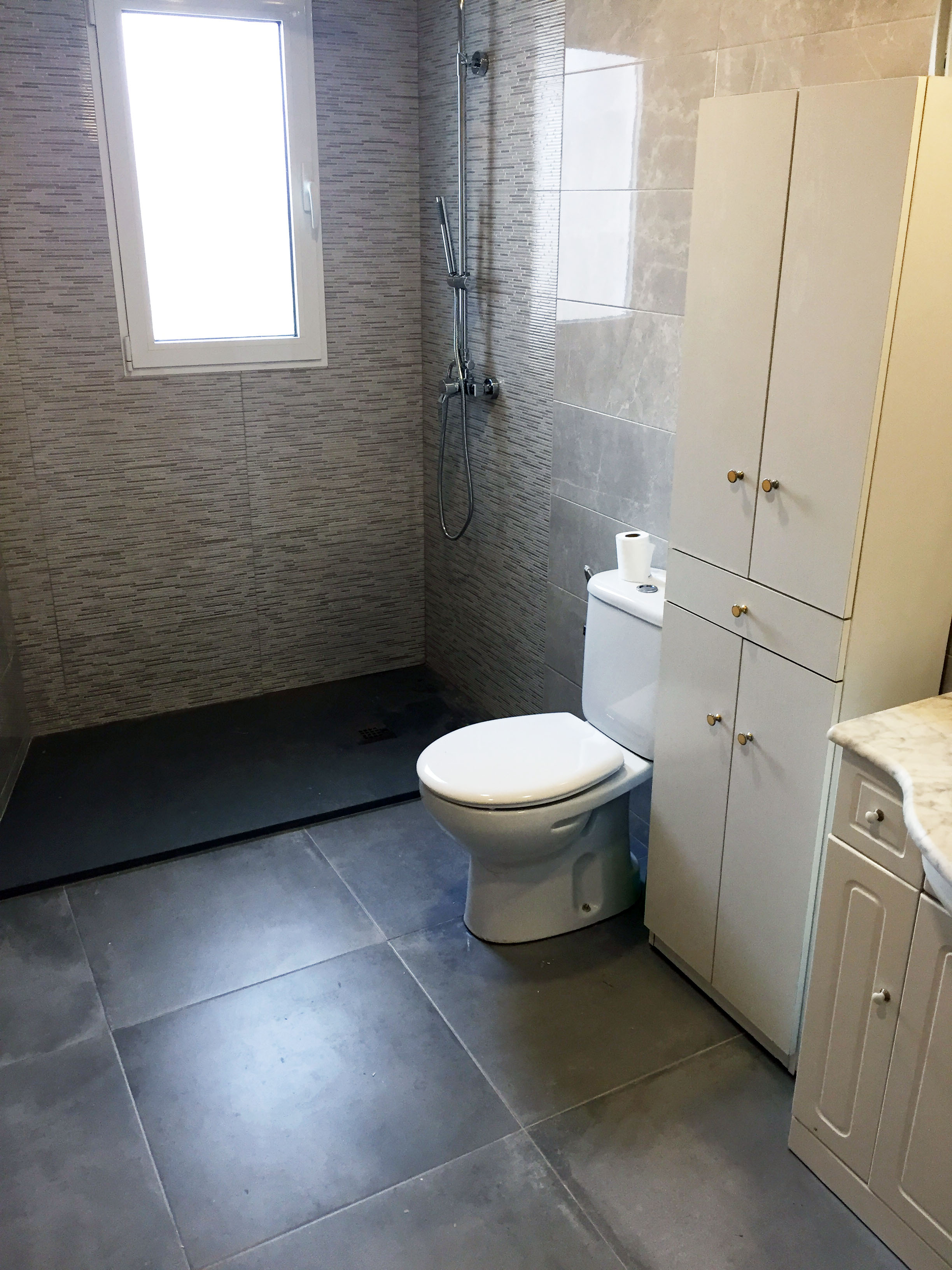 Se ha colocado azulejo decorado gris en la zona de la ducha dejando el resto con azulejo gris marmoleado brillo para dar mayor amplitud y luminosidad al baño. En el suelo se ha colocado pavimento porcelánico 40×40 imitación hormigón que va perfecto para la limpieza del baño.