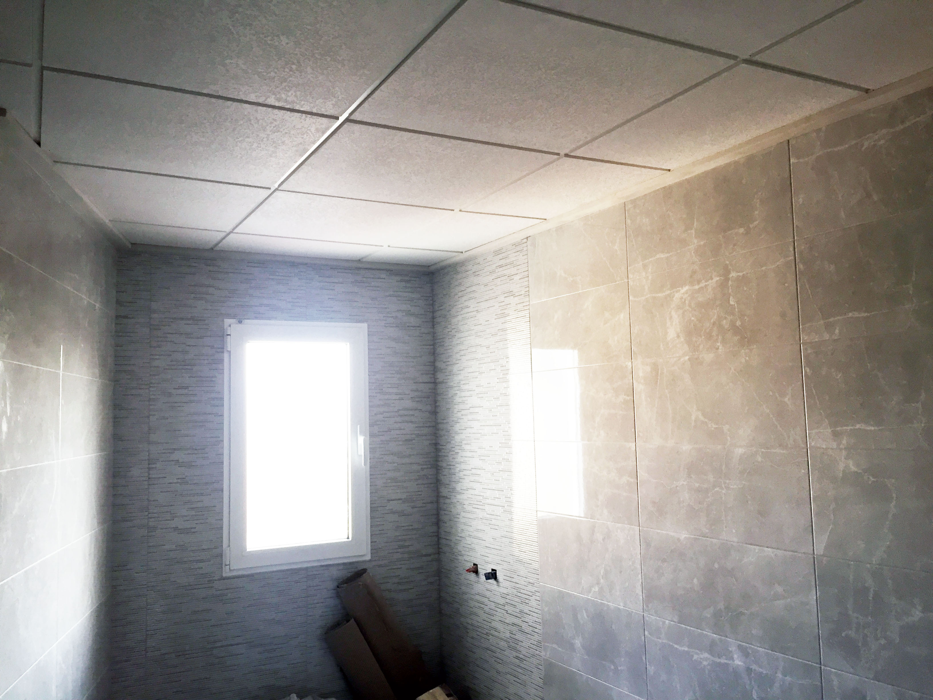En cuanto al falso techo, éste se ha rematado con moldura tipo fosa perimetral y placas de escayola desmontable con perfil de aluminio blanco.