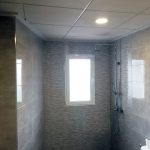 Puesto que la instalación de fontanería se ha cambiado por completo en toda la vivienda, se ha aprovechado para colocar un falso techo de pladur en la zona del pasillo para tapar las instalaciones, la altura inicial del pasillo nos ha permitido hacerlo sin mayores complicaciones. Todo el pasillo se ha rematado con moldura perimetral y se ha iluminado con ojos de buey de led.