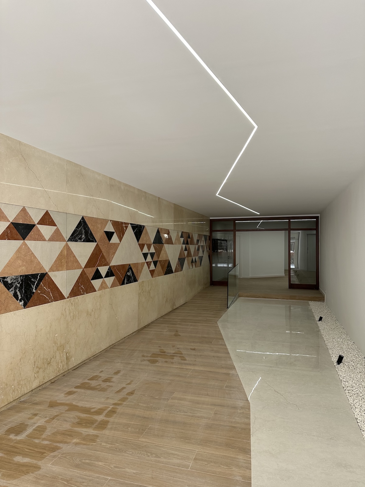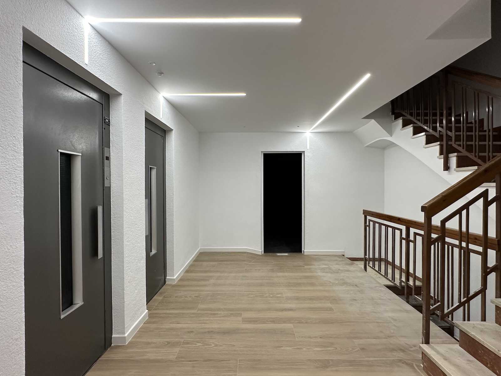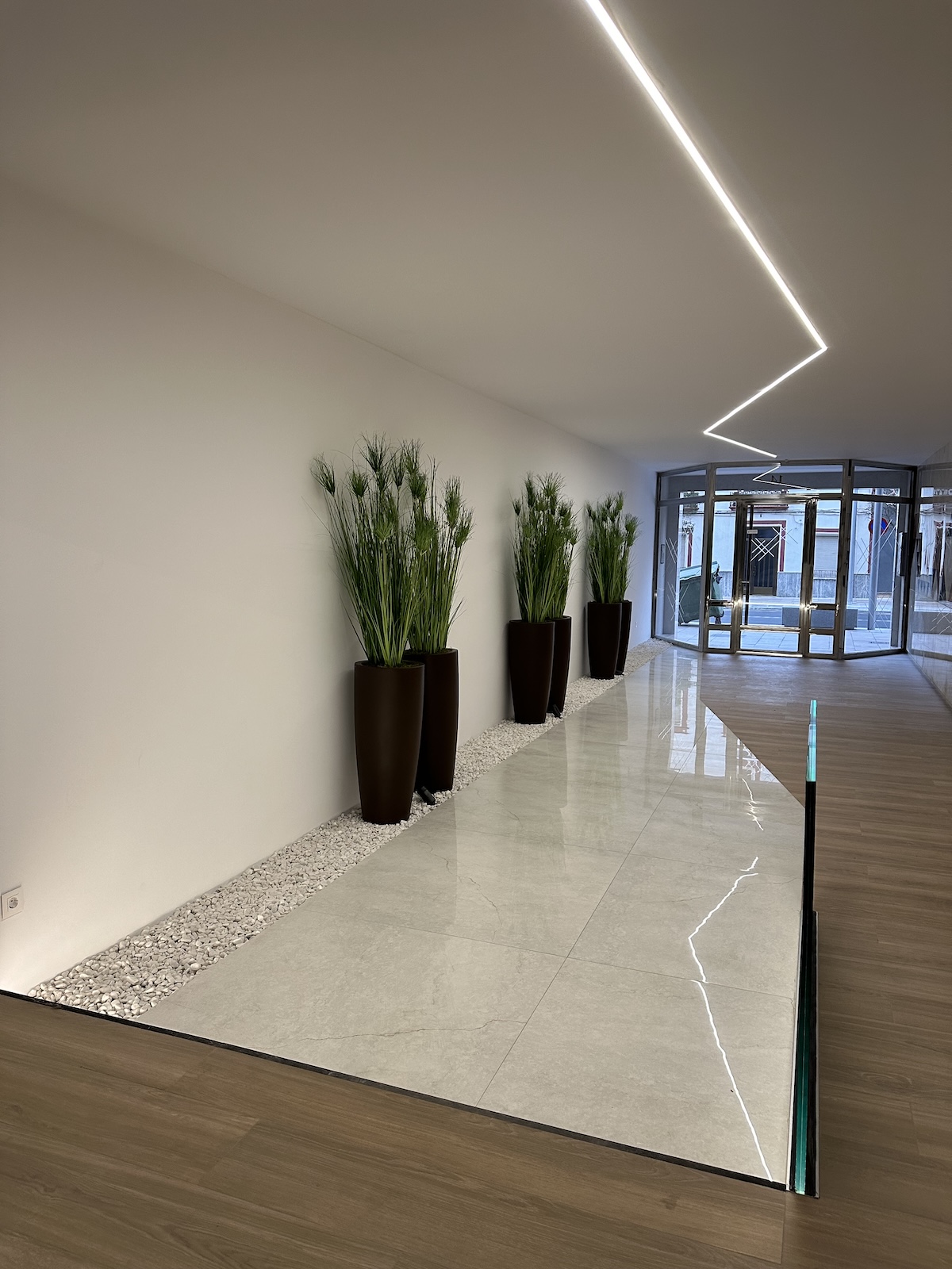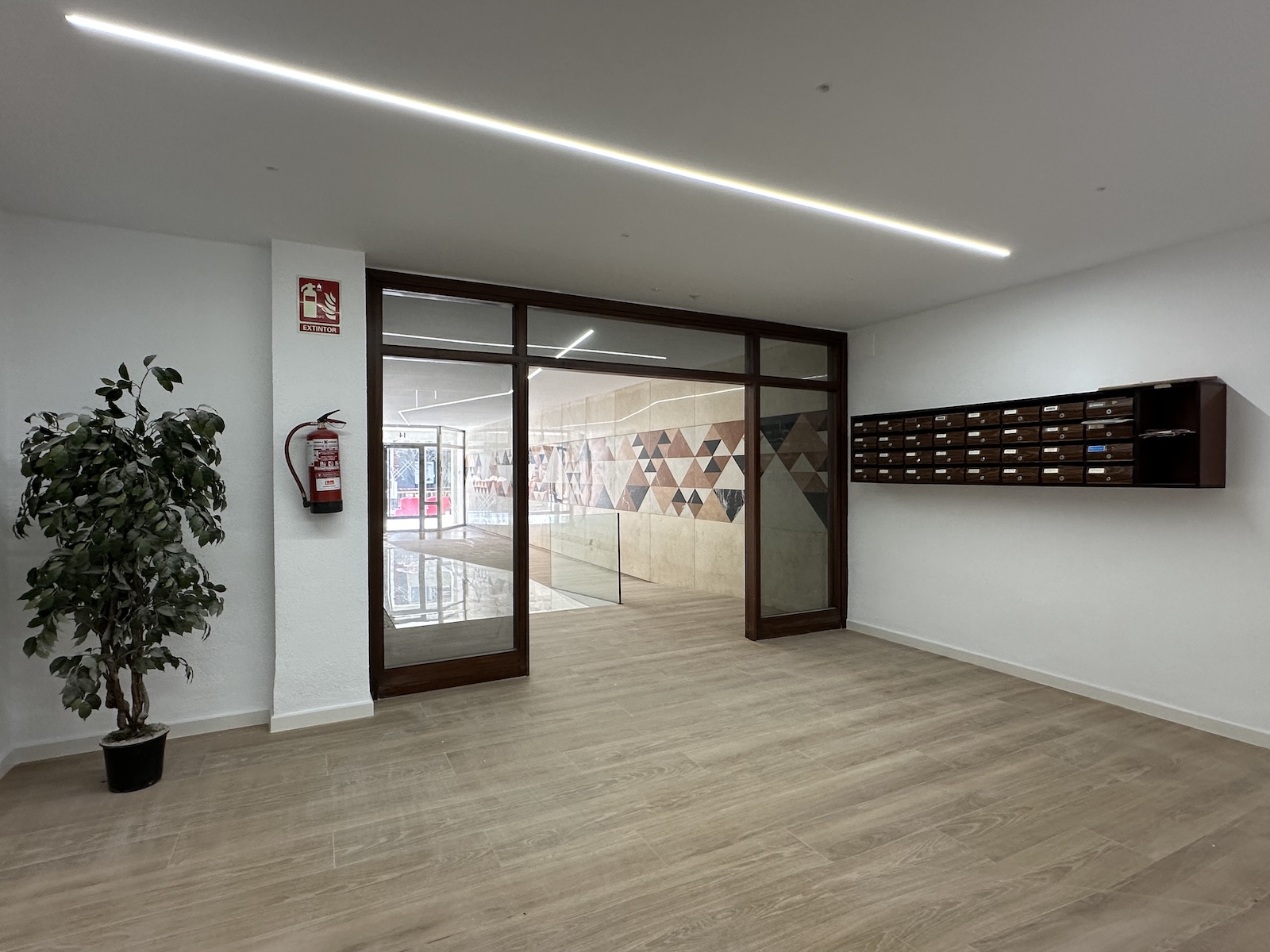 También se ha mejorado la iluminación de todo el zaguán, zonifícando con diferentes luminarias y dotando al sistema de relojes y crepusculares que permiten que el zaguán siempre tenga un mínimo de iluminación para usuarios.