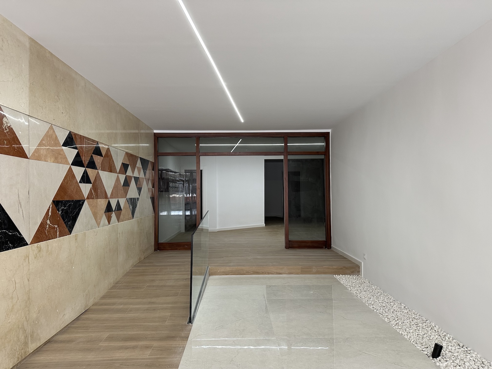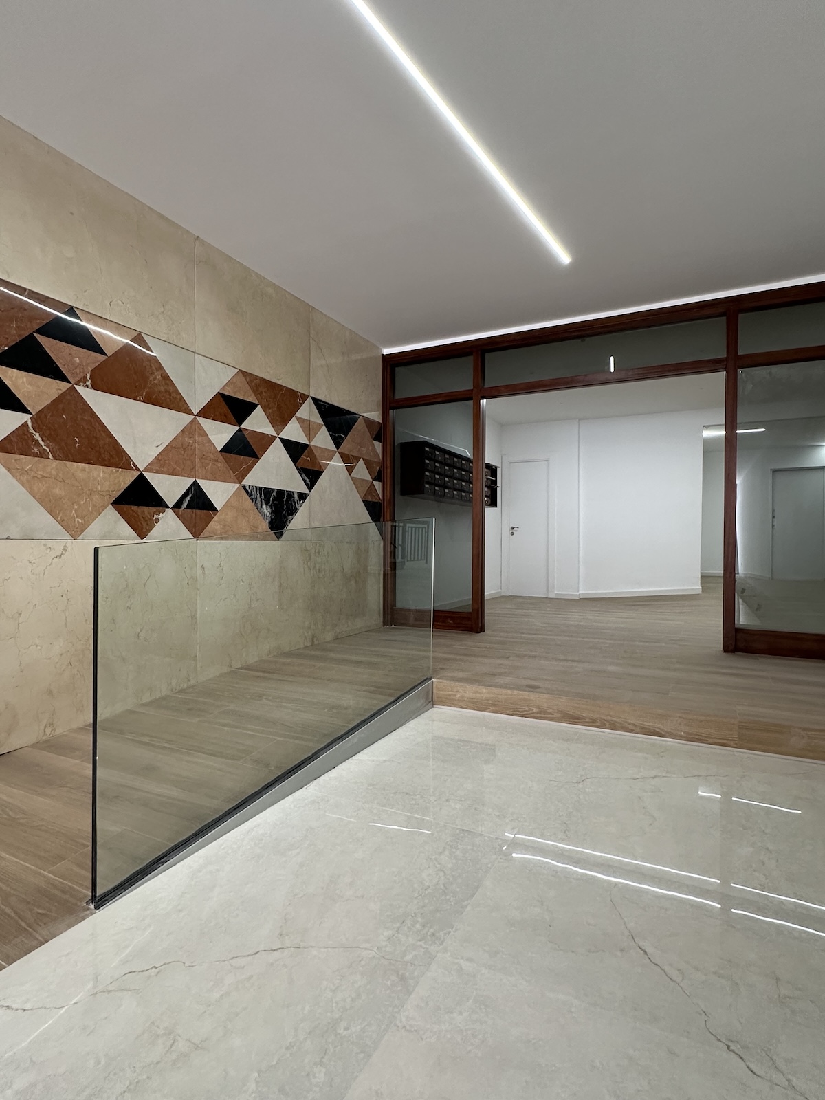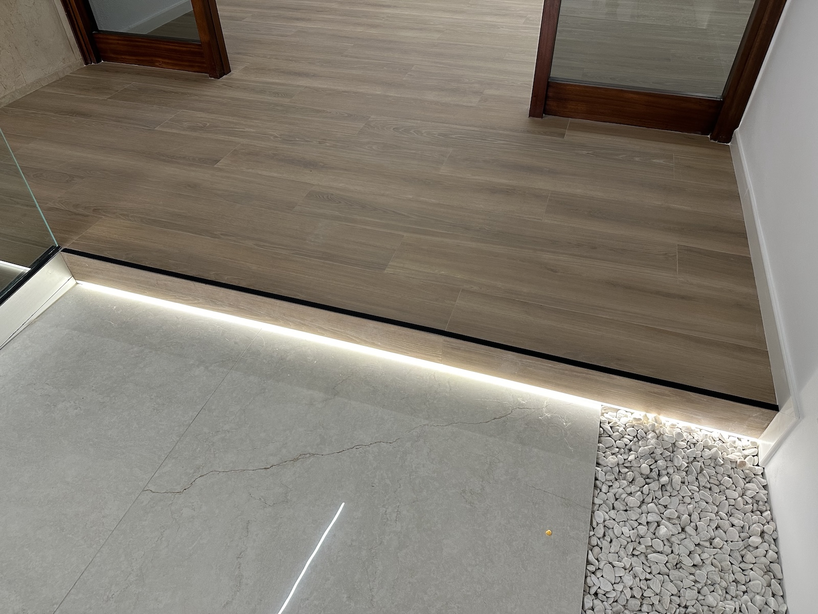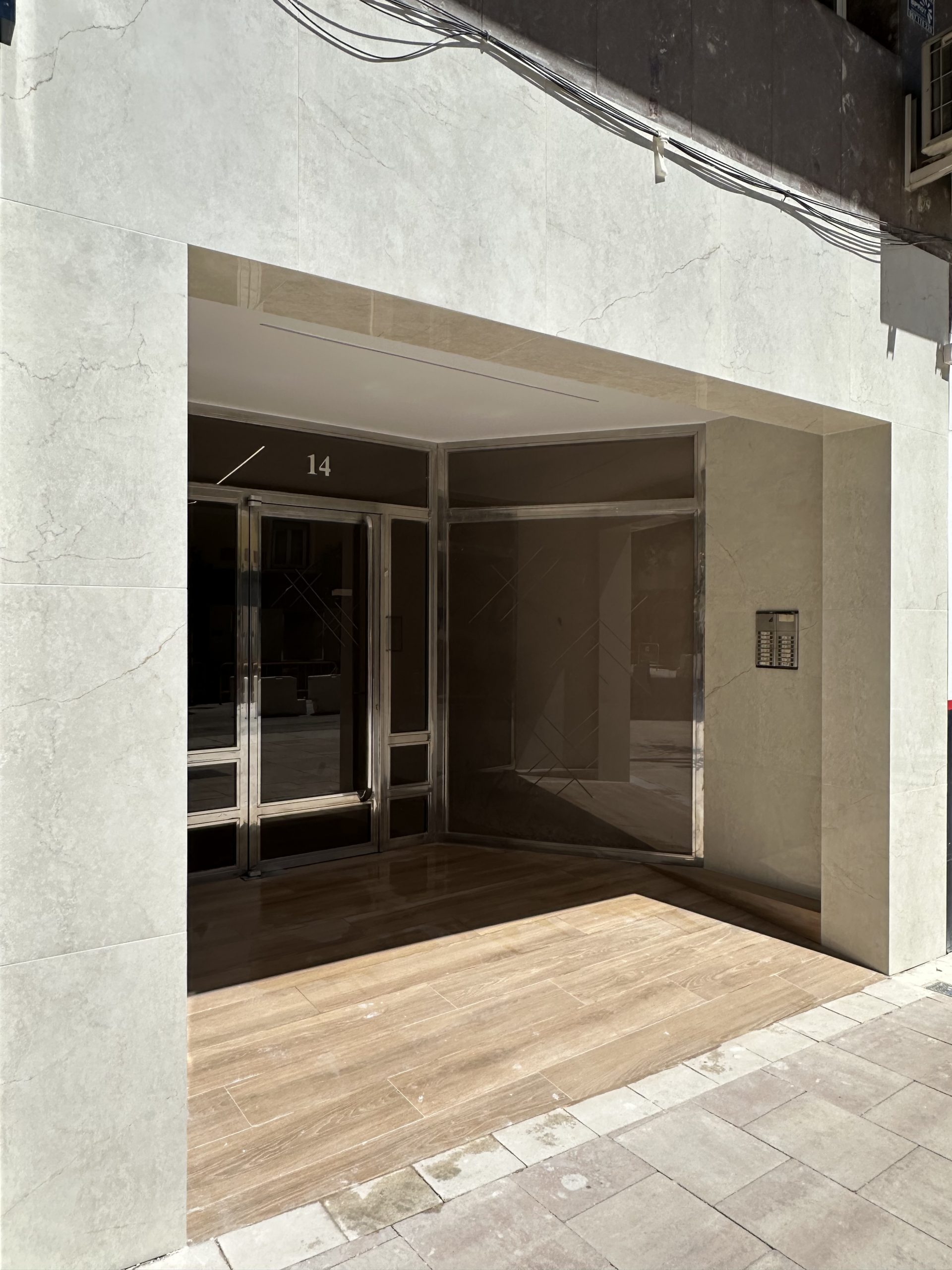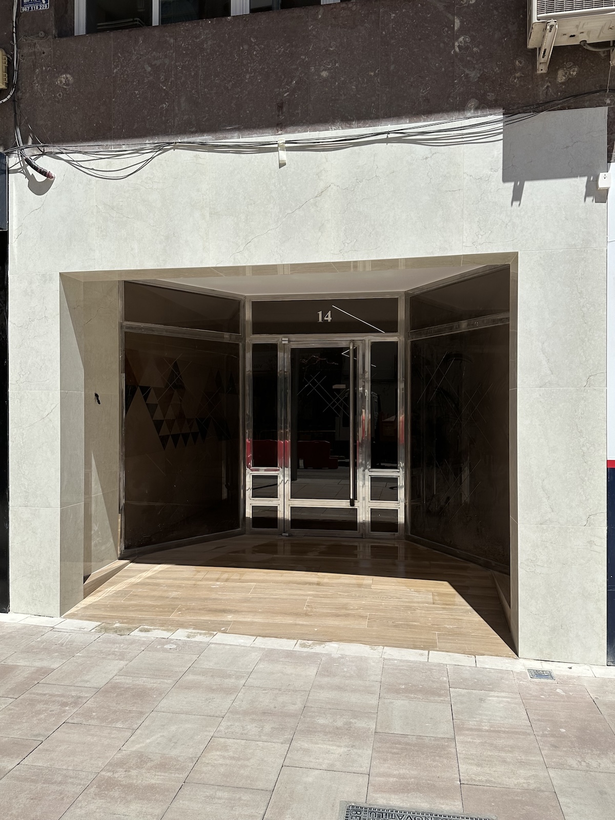 Por último, el umbral de la puerta se ha reformado con azulejo alto brillo imitación a mármol, y se ha respetado la puerta existente de acero inoxidable.