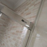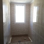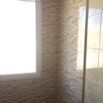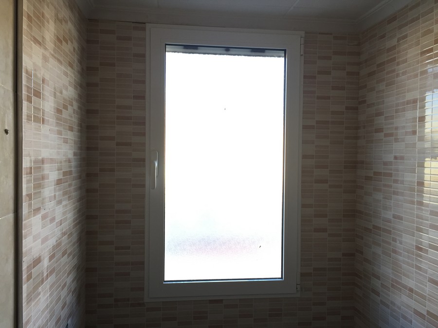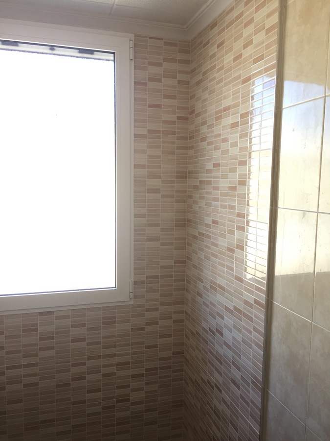 Se ha sustituido únicamente el azulejo de la zona de ducha, así como el pavimento de todo el baño, de esta forma, el impacto ha sido mínimo, y el cambio espectacular. También se ha sustituido la ventana de aluminio corredera por una de aluminio lacado en blanco oscilo batiente.