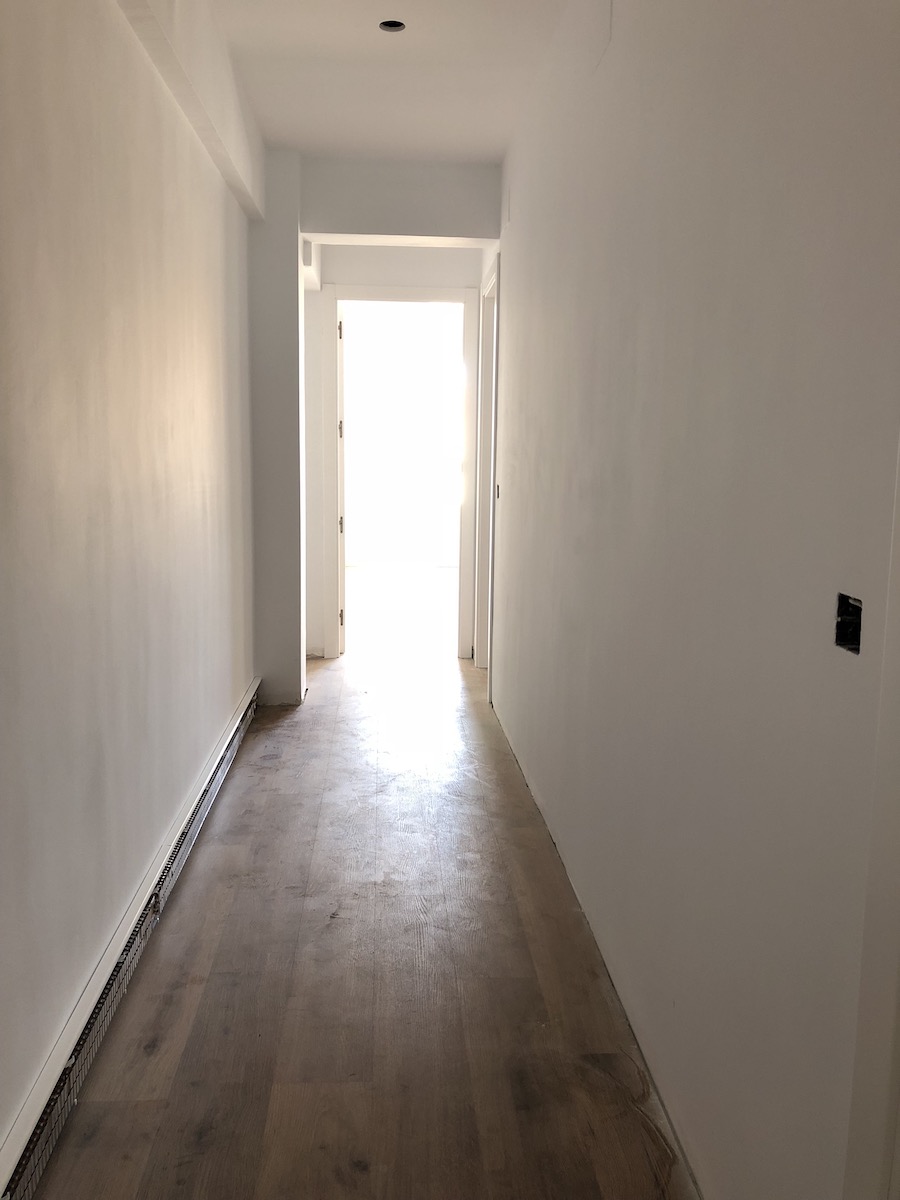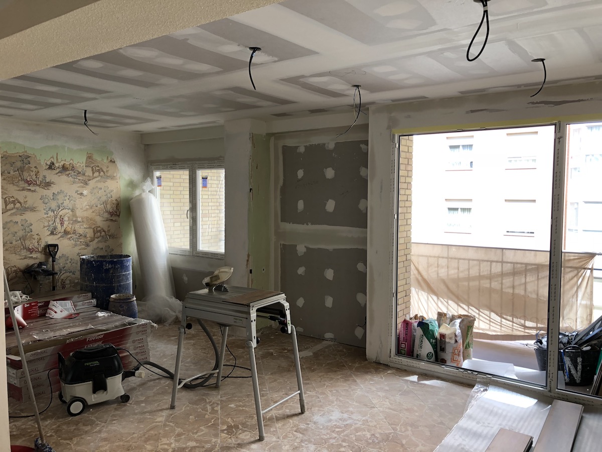 Se han trasdosado las fachadas principal y posterior, colocado falsos techos, tarima flotante en toda la vivienda excepto en cuartos húmedos, en los cuales se ha instalado pavimento porcelánico imitación madera.
