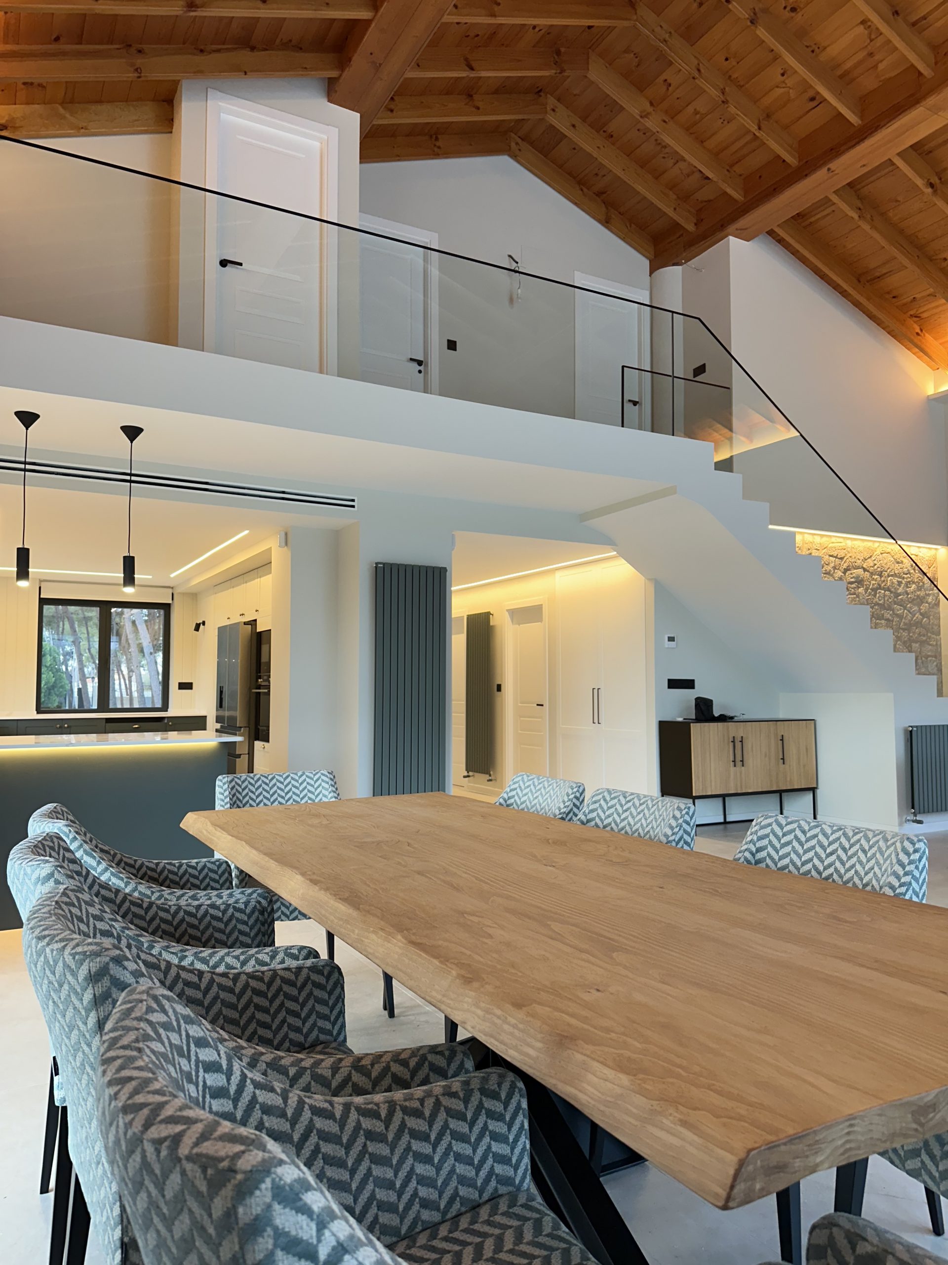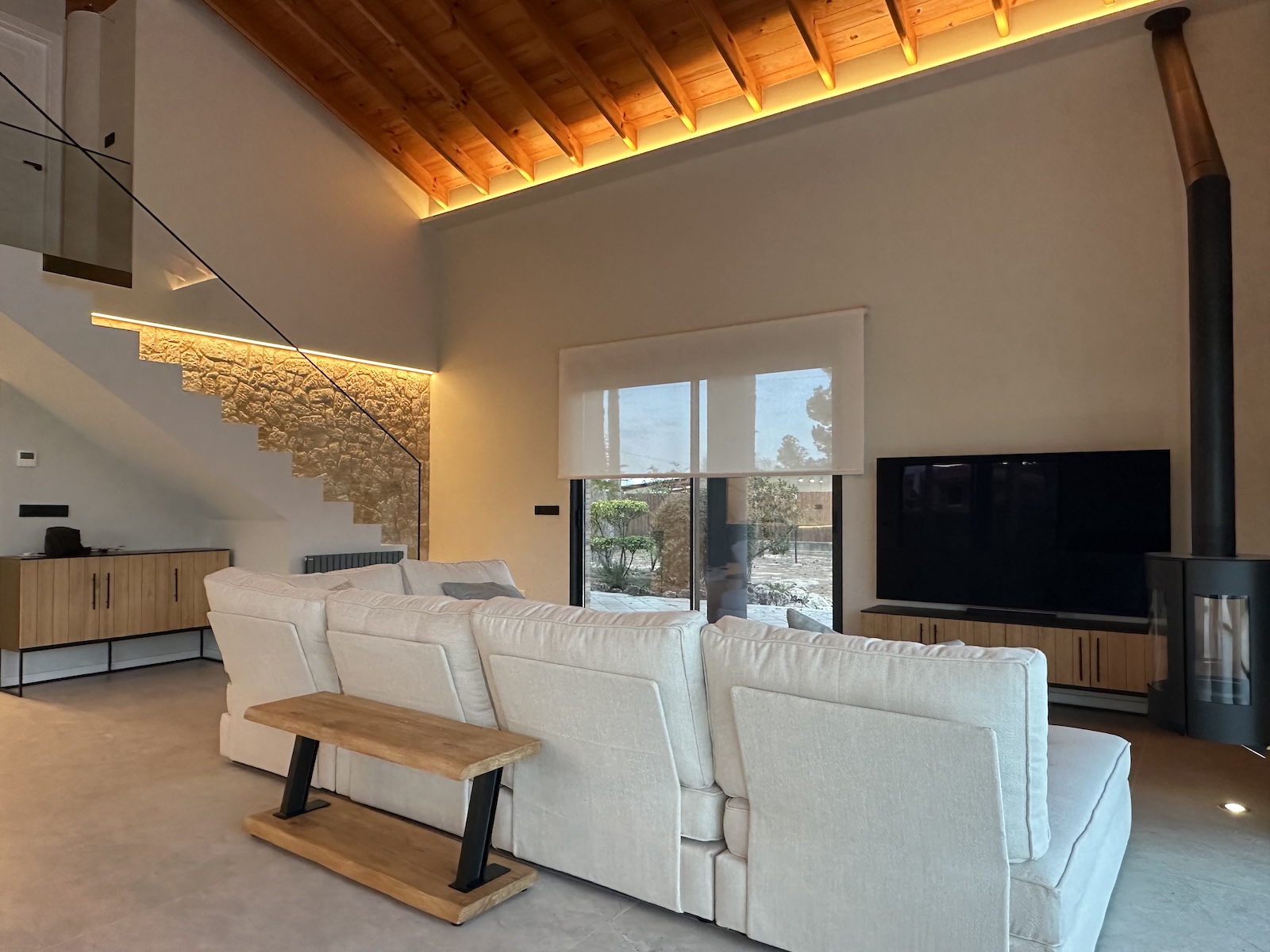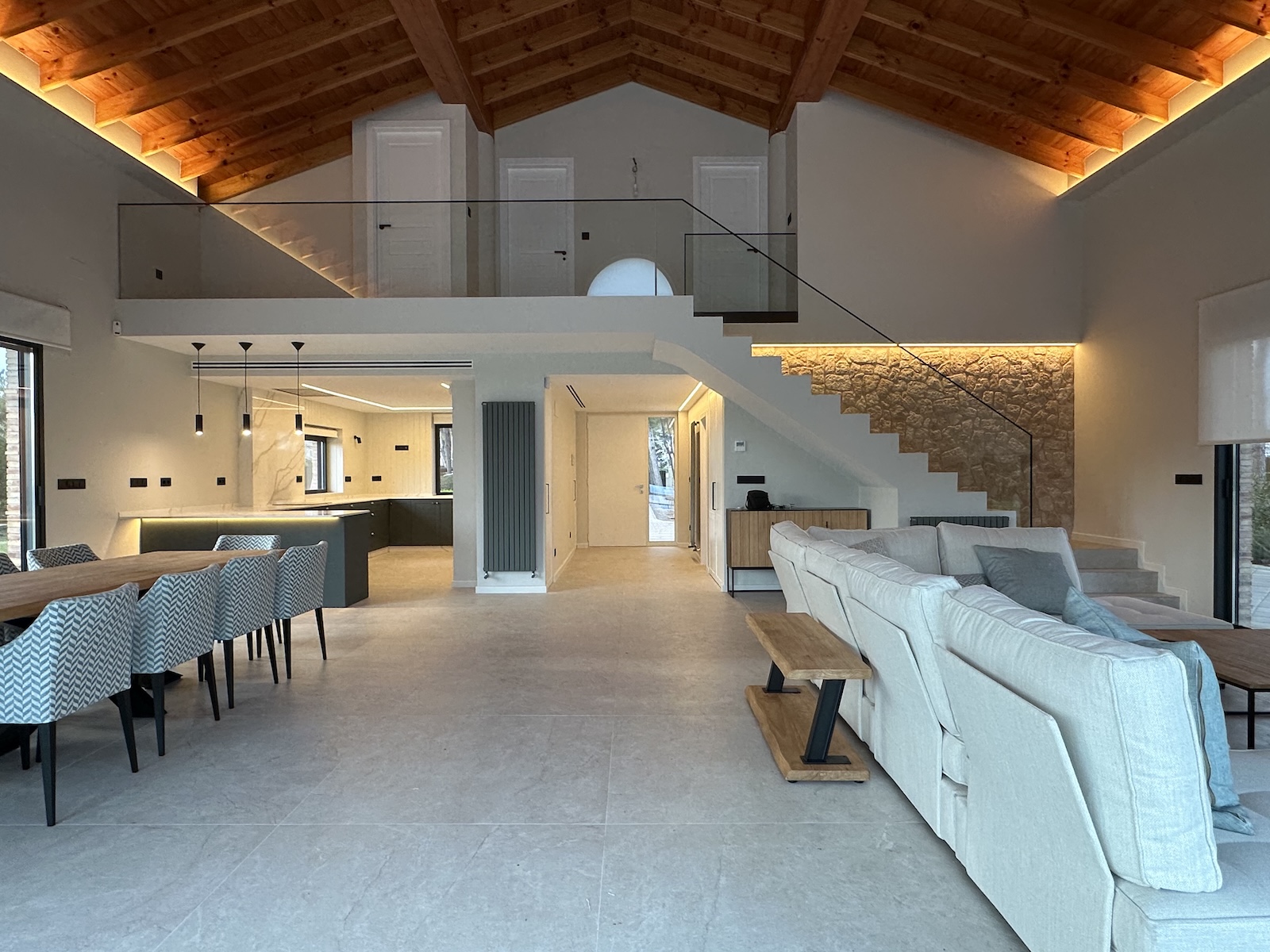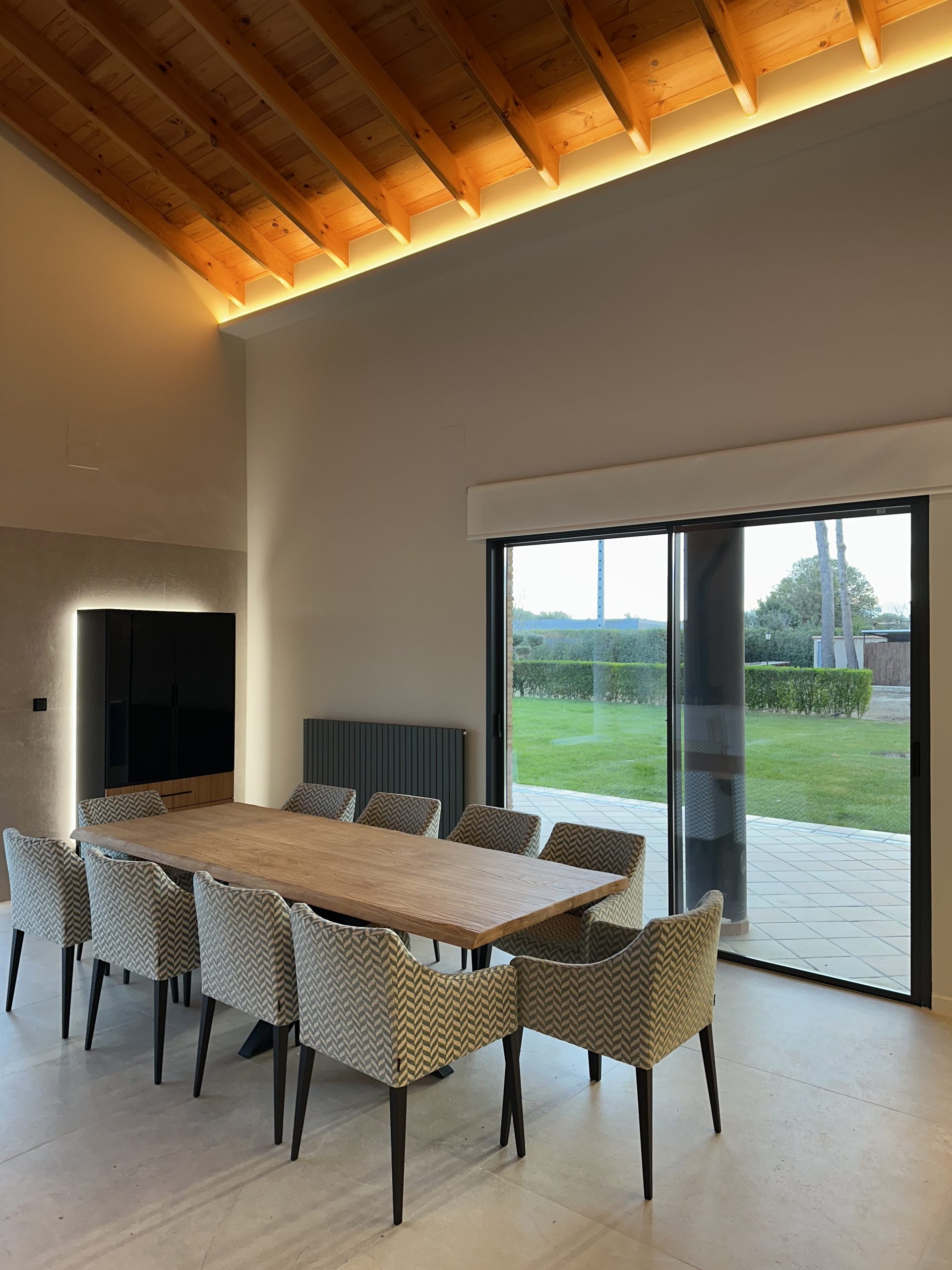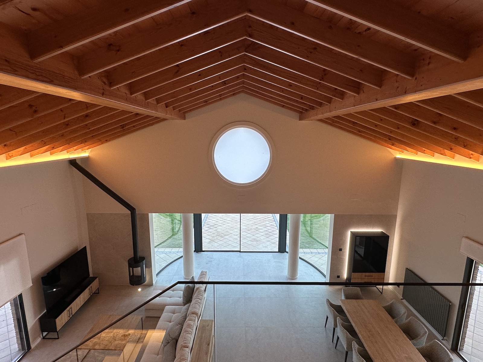 El protagonista de esta vivienda es el techo de madera machihembrado y su imponente estructura vista.