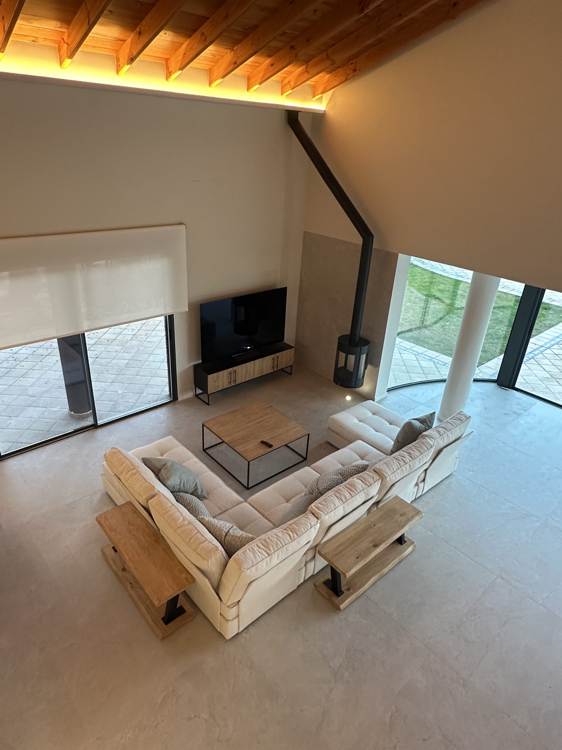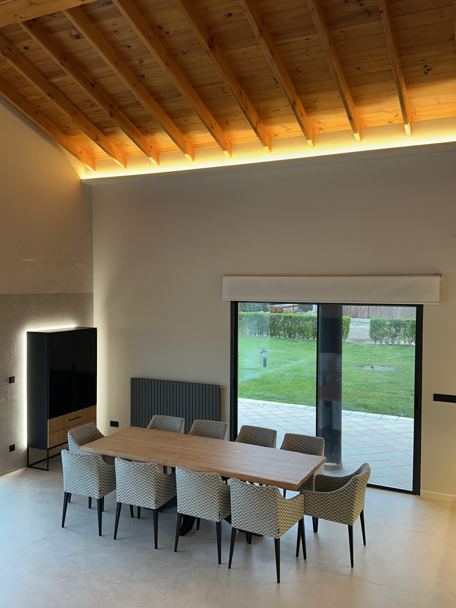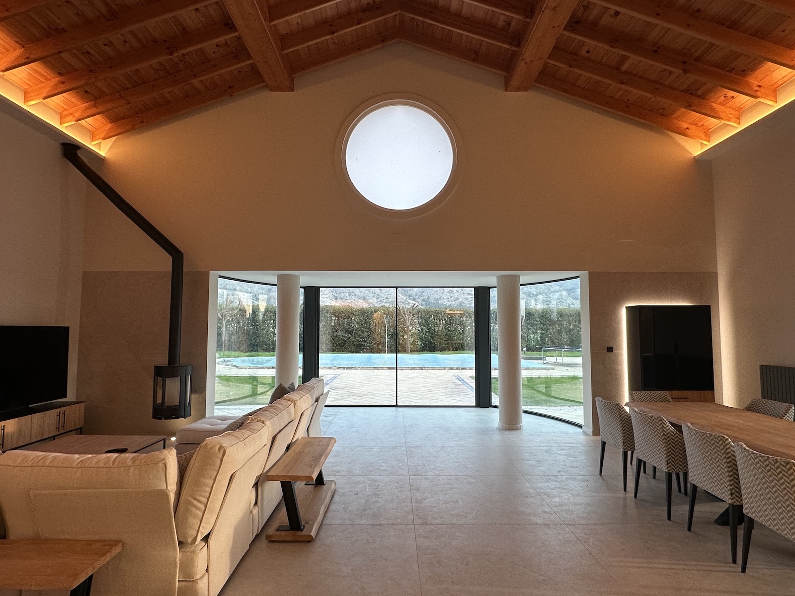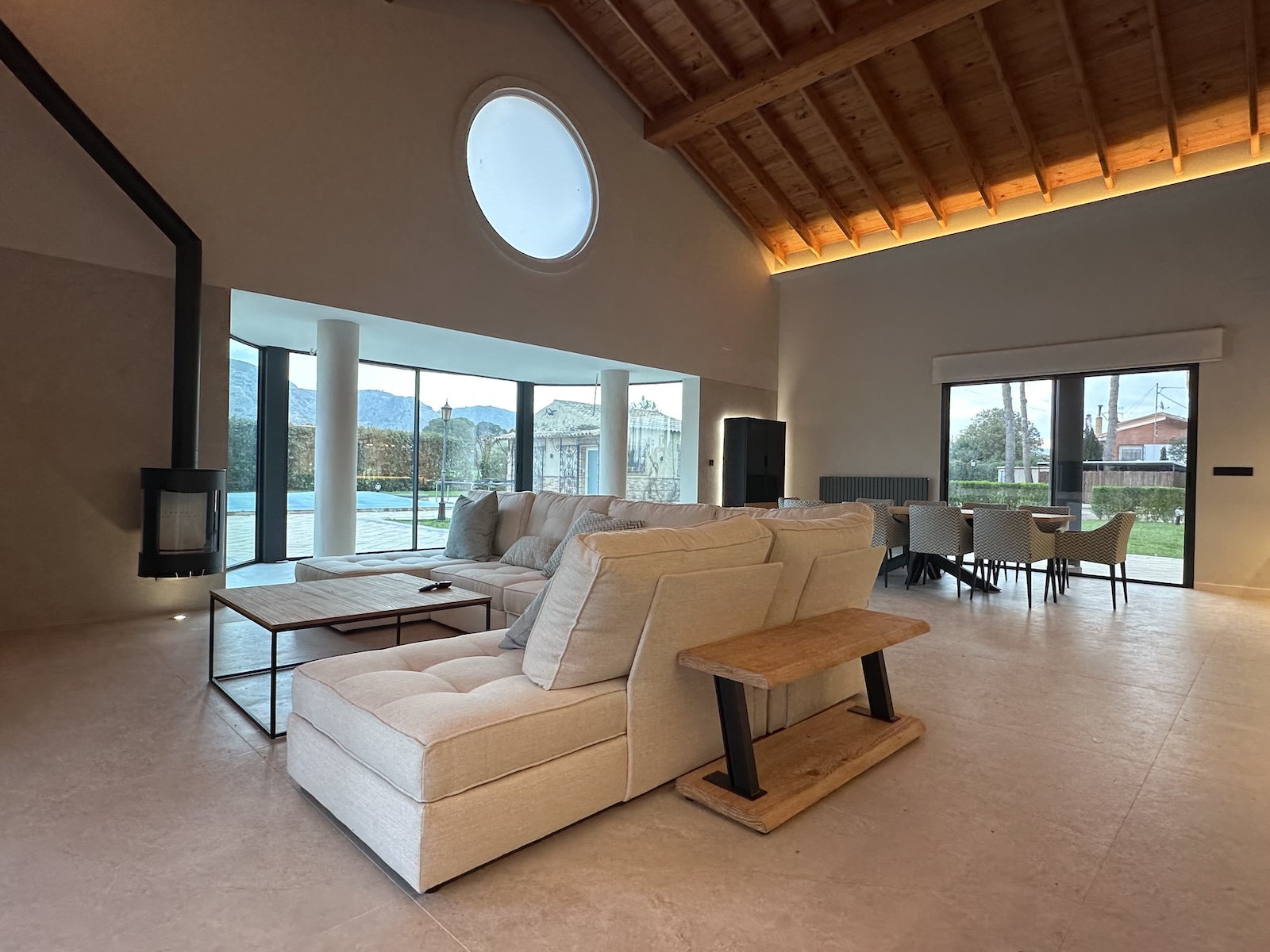 El protagonista de esta vivienda es el techo de madera machihembrado y su imponente estructura vista.