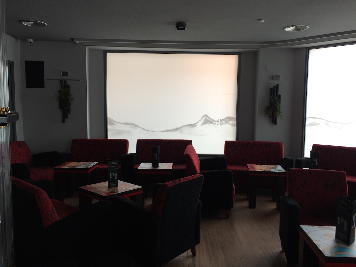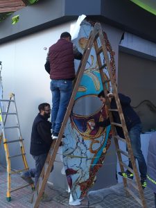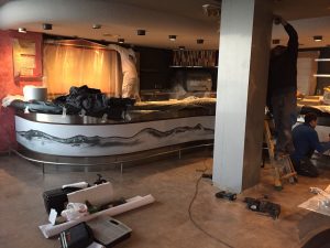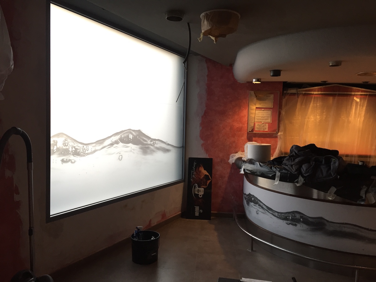 En la zona de barra, se ha vinilado la parte inferior con la misma decoración que los escaparates de la fachada. Se ha colocado iluminación LED indirecta superior. En la zona superior de barra se ha colocado un jardín vertical artificial que dota de color a dicha zona.