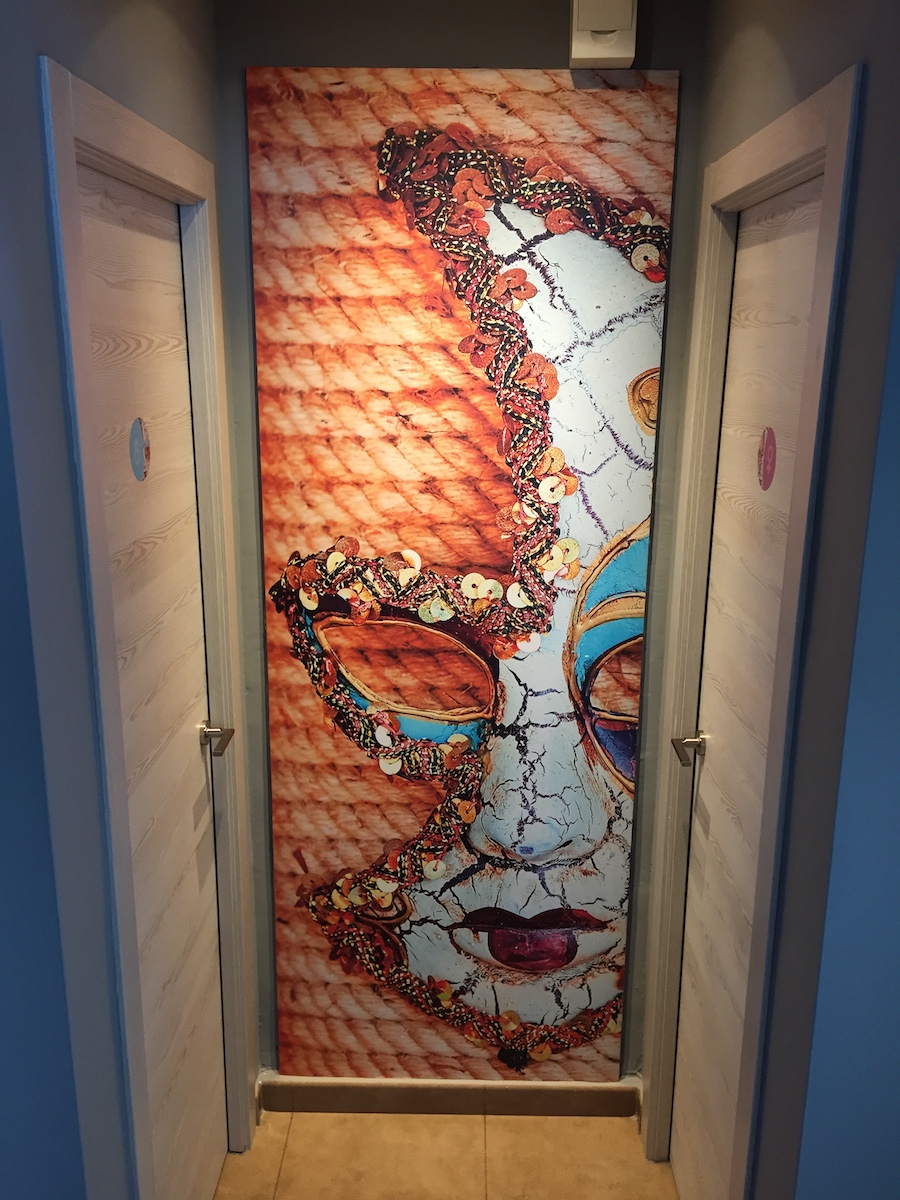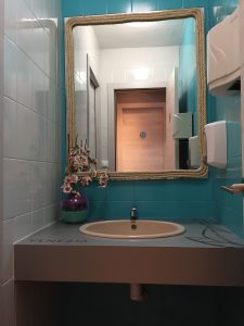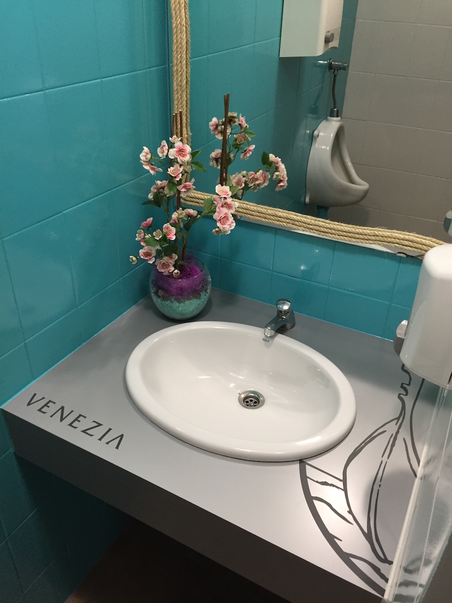 Los baños también se han modernizado pintando las paredes con pintura epoxi. Los lavabos se han forrado con el mismo material que la fachada y se han rotulado con la nueva imagen corporativa.