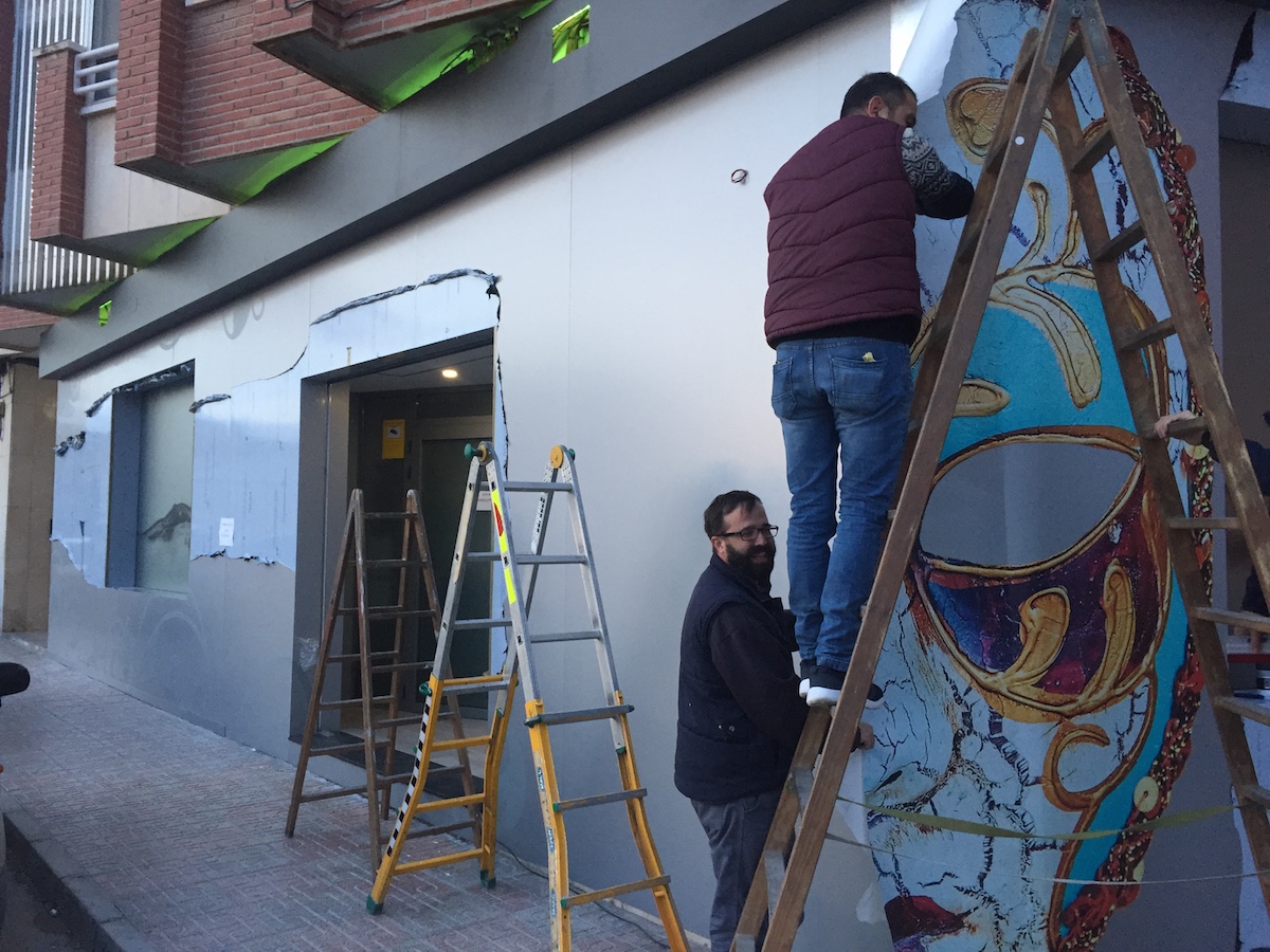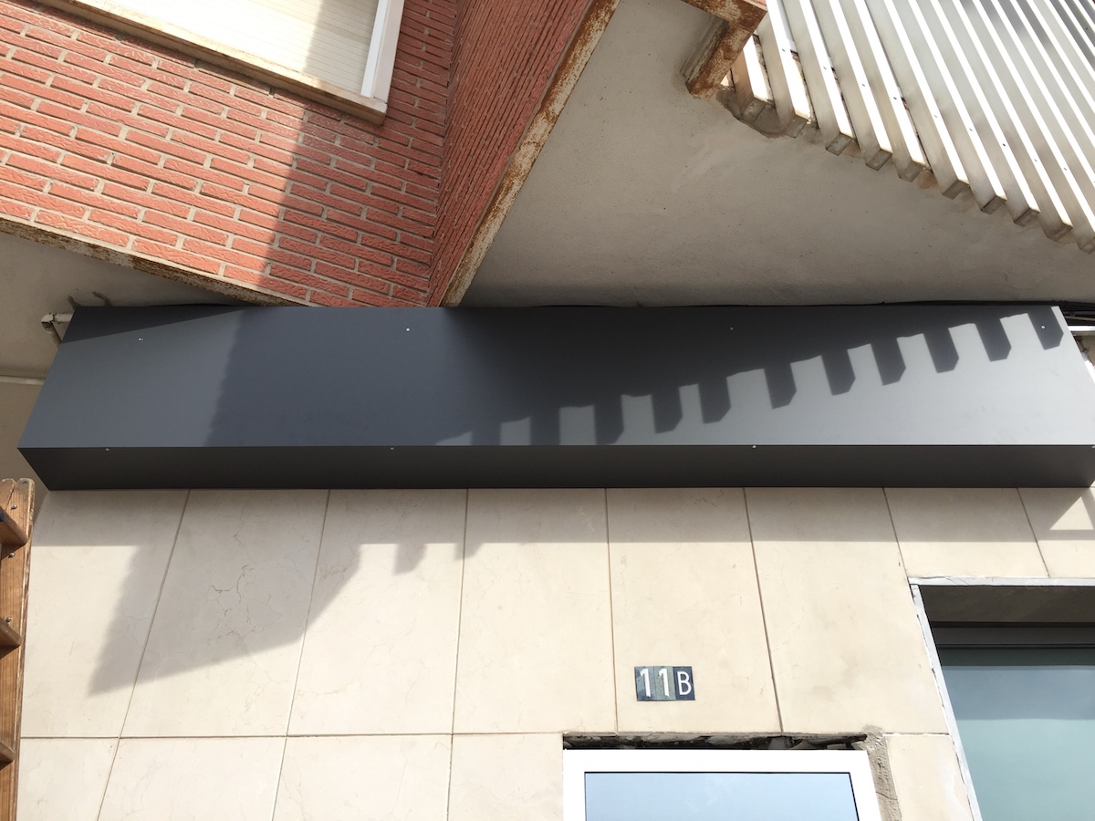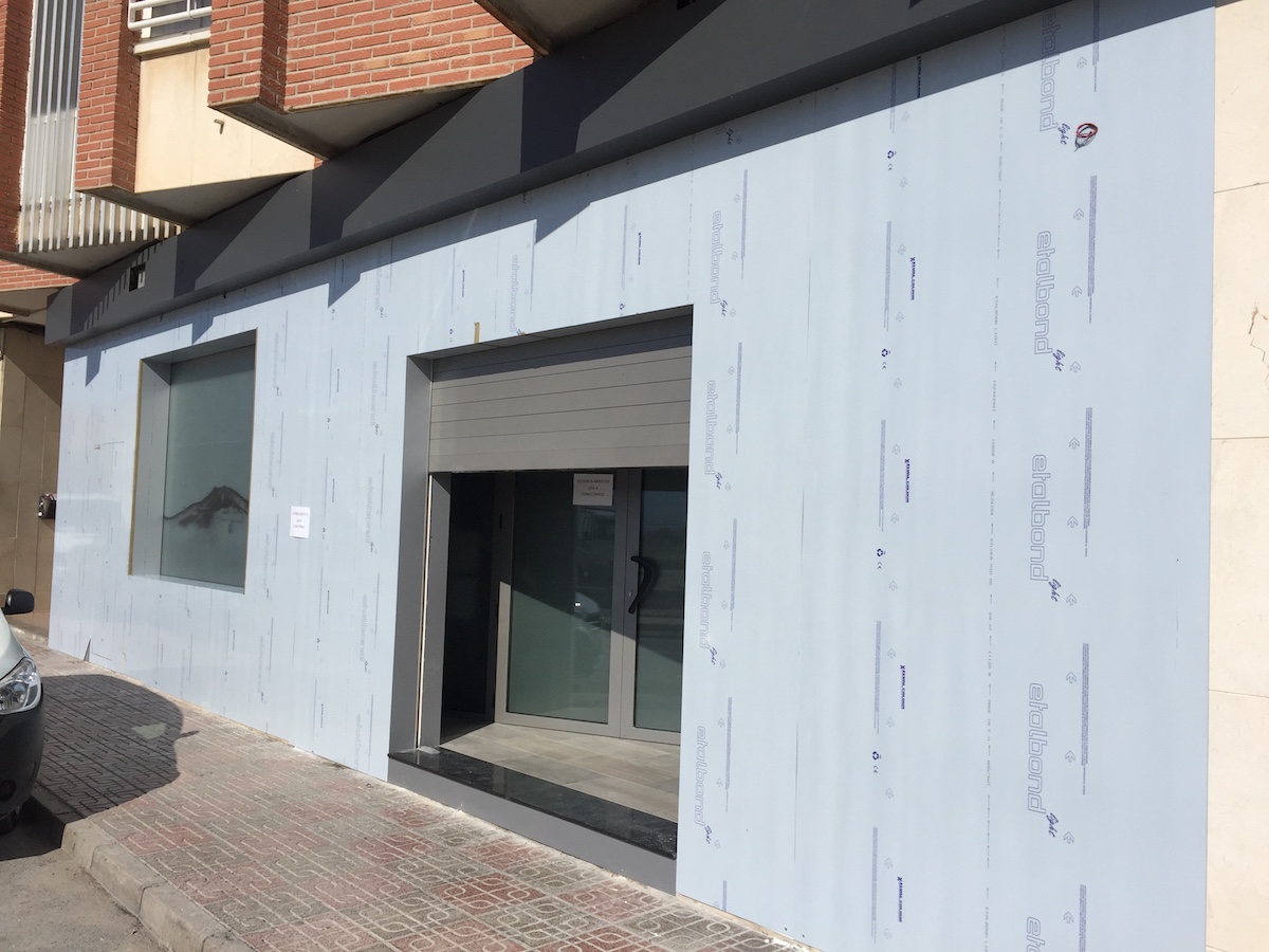 La fachada se ha forrado por completo con composite color gris y sobre éste se ha rotulado la nueva imagen corporativa. Se ha creado una bandeja superior para disimular todos los cables existentes en la fachada, y se han realizado registros para que cada compañía suministradora pueda acceder a sus registros.