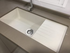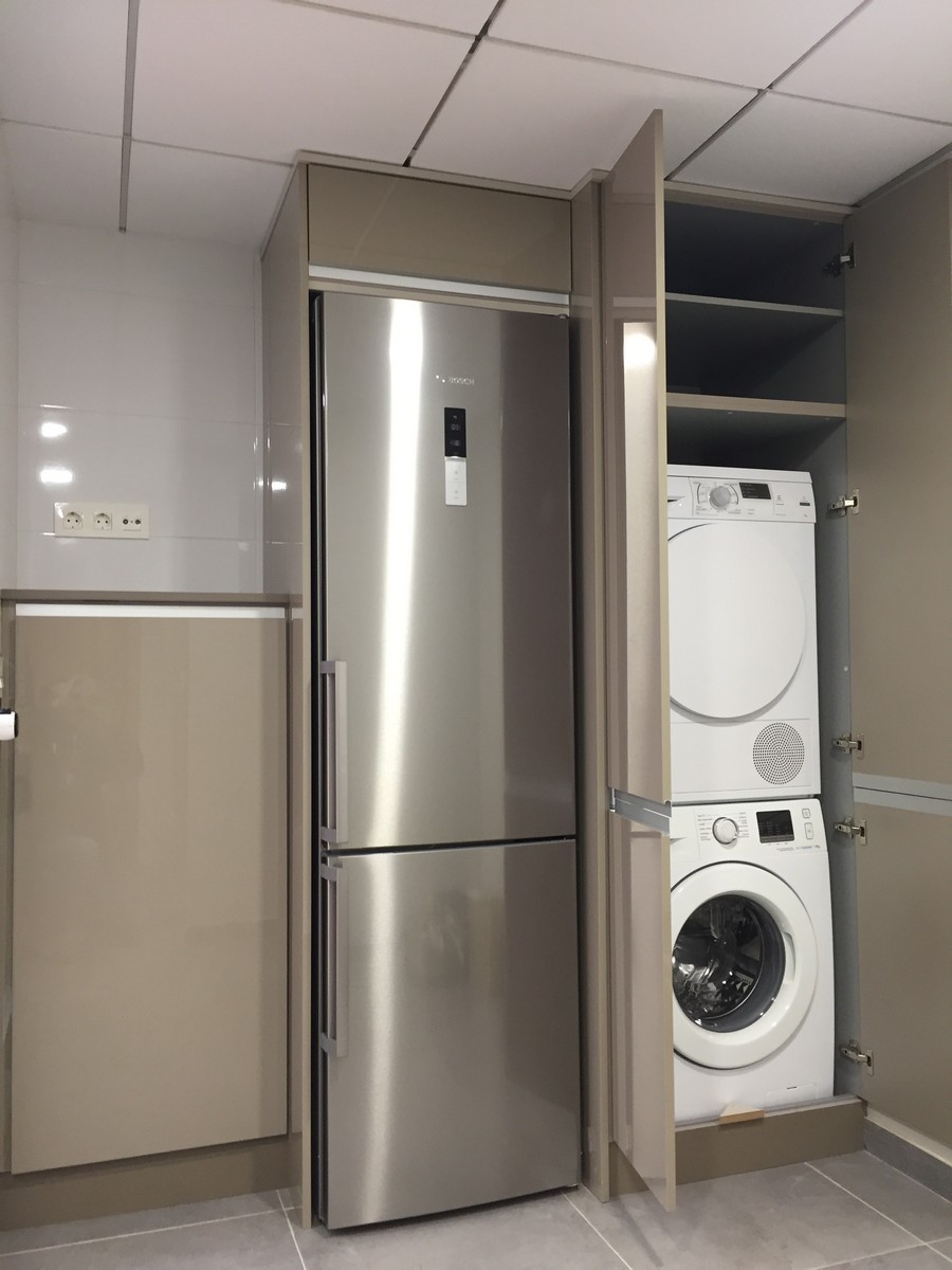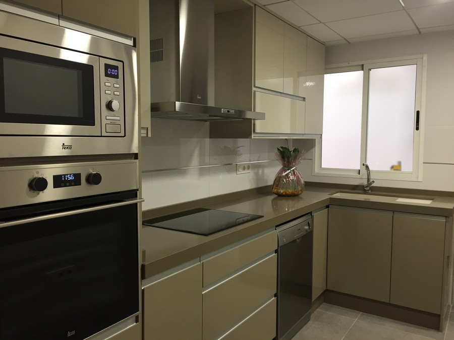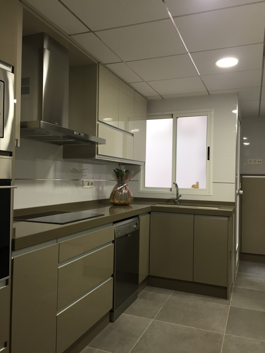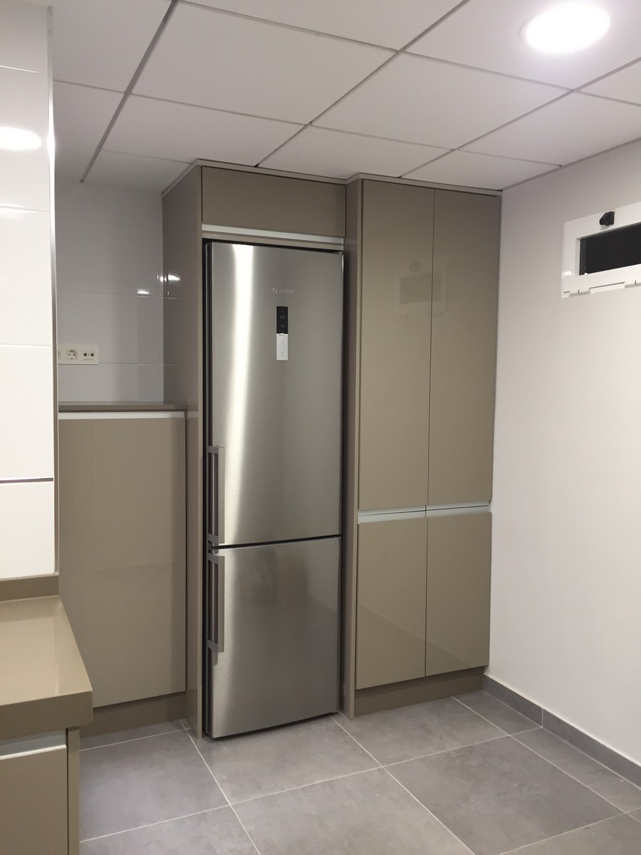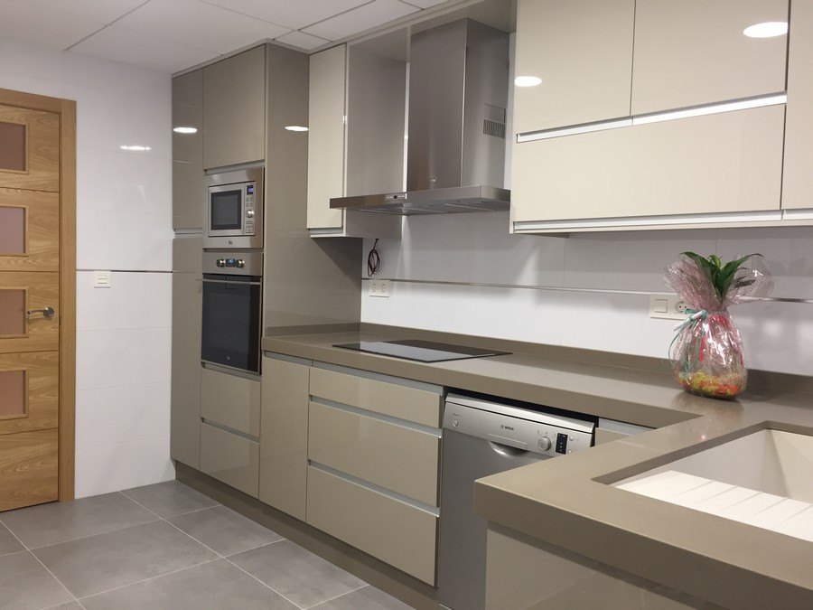 Se han realizado los muebles de cocina con puertas LUXE alto brillo CASHEMIR y tirador integrado en color plata. La encimera es de cuarzo Silestone color NOKA pulido y fregadero bajo encimera color SABLÉ de Mahei.