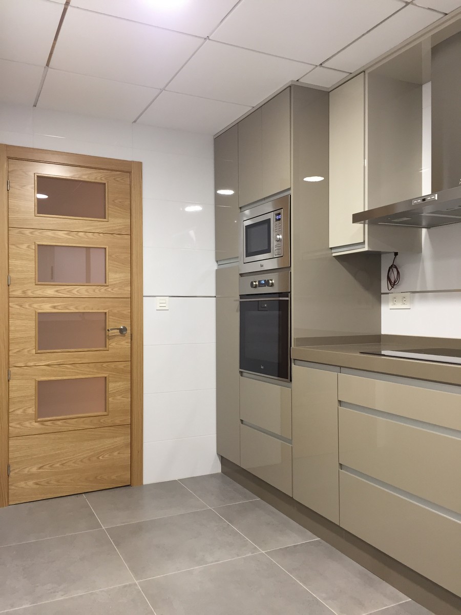 Se ha aprovechado para ampliar la cocina ganando metros con otra habitación, de modo que se han generado dos espacios diferentes, por un lado la zona de cocina y por otro el office. Se ha revestido con aplacado cerámico toda la zona donde existen muebles y la cocina completa, y se ha optado por acabar con pintura lisa la zona de office.