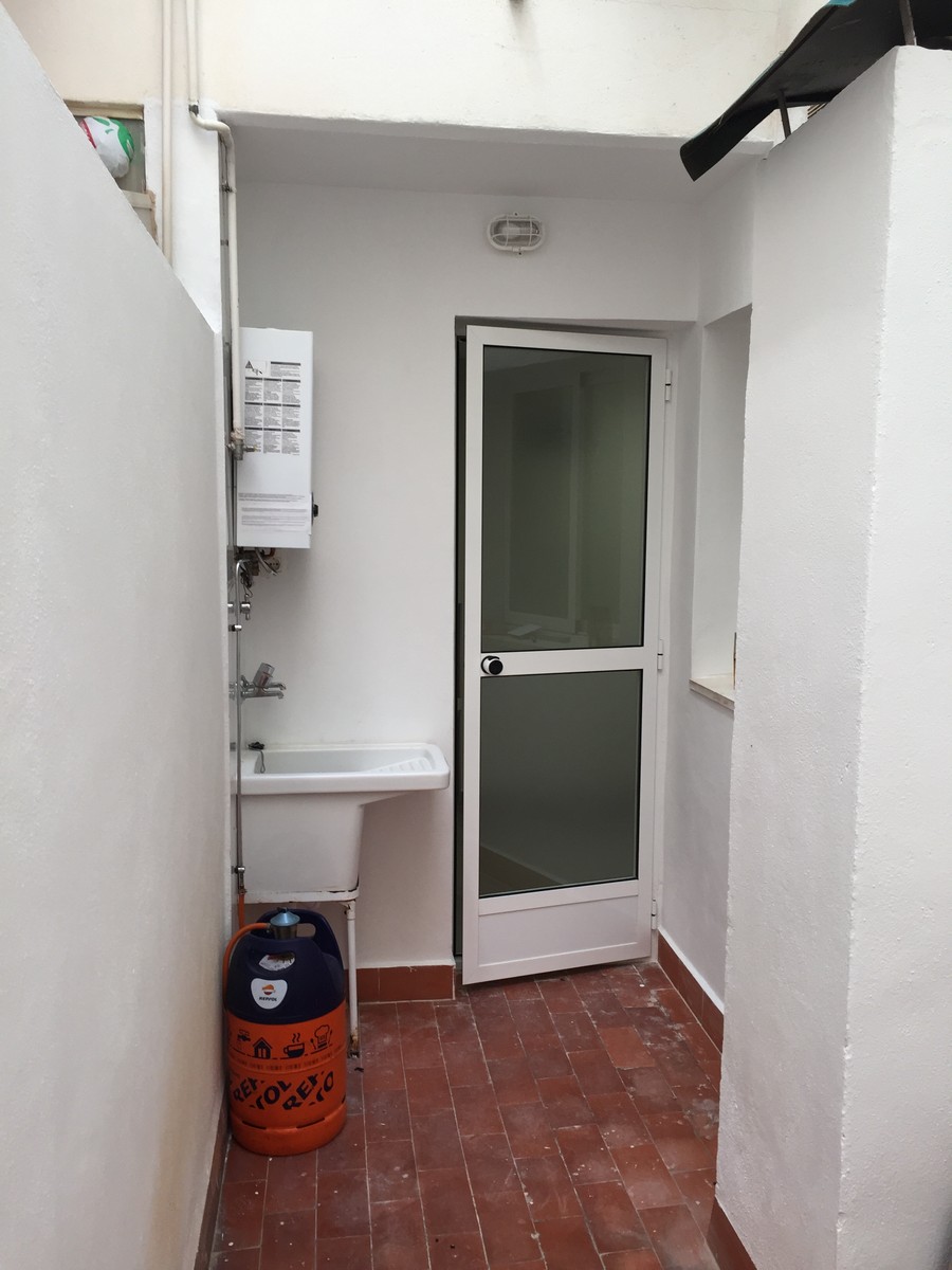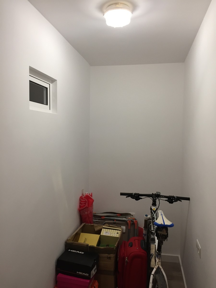 El trozo de habitación resultante de la modificación de cocina se ha aprovechado para dotar a la vivienda de un trastero dentro de la misma. A este trastero se le ha dado ventilación e iluminación natural a través de la cocina mediante una ventana de aluminio abatible.