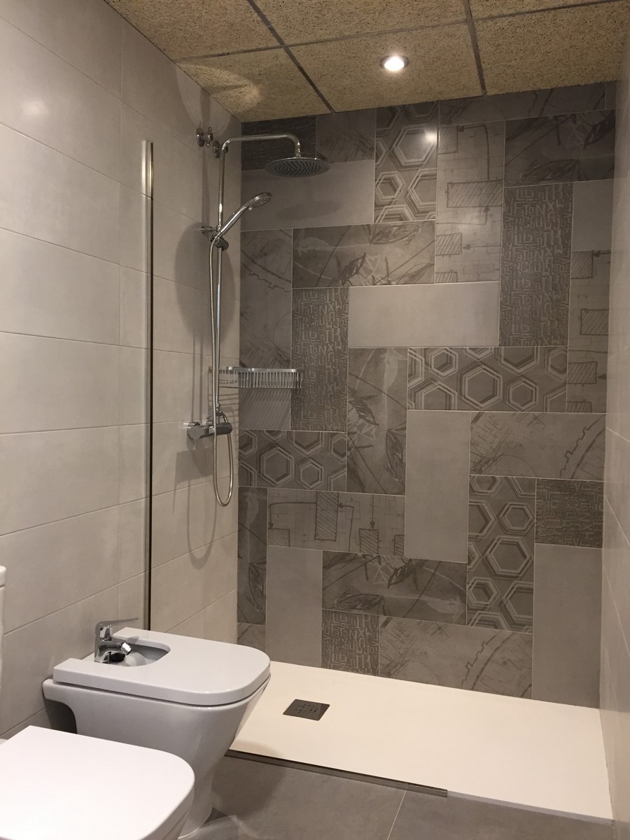 img_8484En el baño de matrimonio se ha sustituido la bañera existente por un plato de ducha extraplano. Se ha optado por azulejos en tonos grises claros para dar luminosidad al baño, y en la pared de la ducha se ha colocado un mosaico decorativo que da un aspecto de profundidad genial.