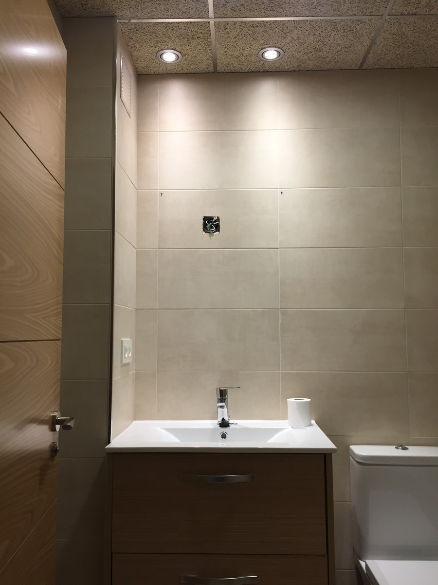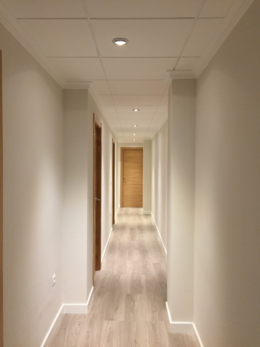 El falso techo se ha colocado de escayola desmontable con perfilería cromo brillo y placa de 60×60 tipo «alga». La iluminación también es toda de LED.