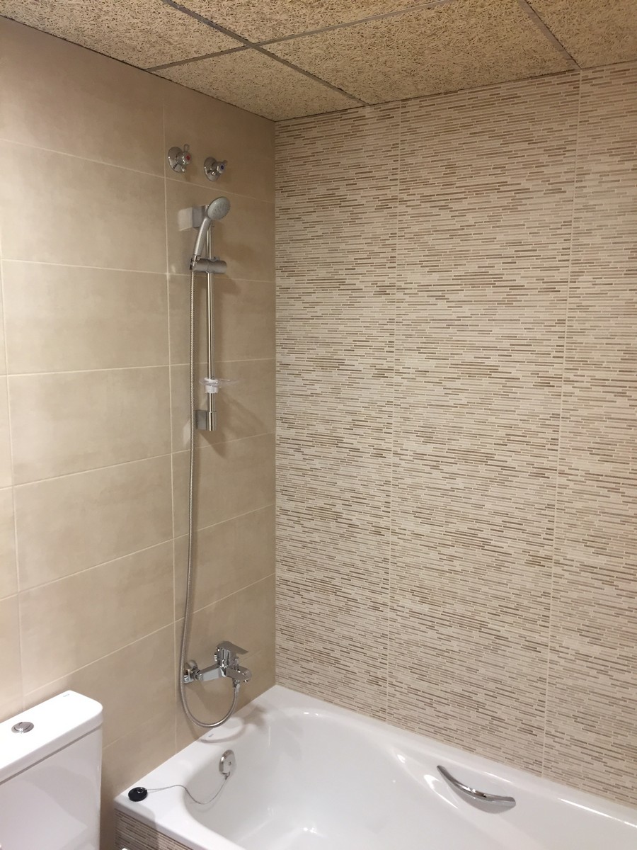 img_8472En el baño del pasillo, se ha eliminado el plato de ducha y el bidé y se ha colocado una bañera de lado a lado, bajandola todo lo que nos ha permitido el desagüe para un acceso más cómodo a la misma. En esta zona se ha colocado un azulejo decorativo alistonado en tonos marrón y beige a juego del pavimento porcelánico y del resto de azulejos del baño.